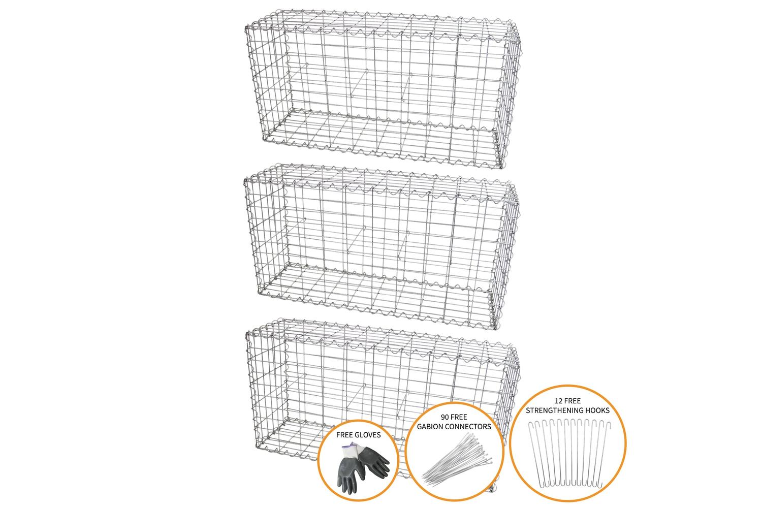 The set also consists of 90 extra gabion connectors, provided for free to solidly attach multiple baskets together.