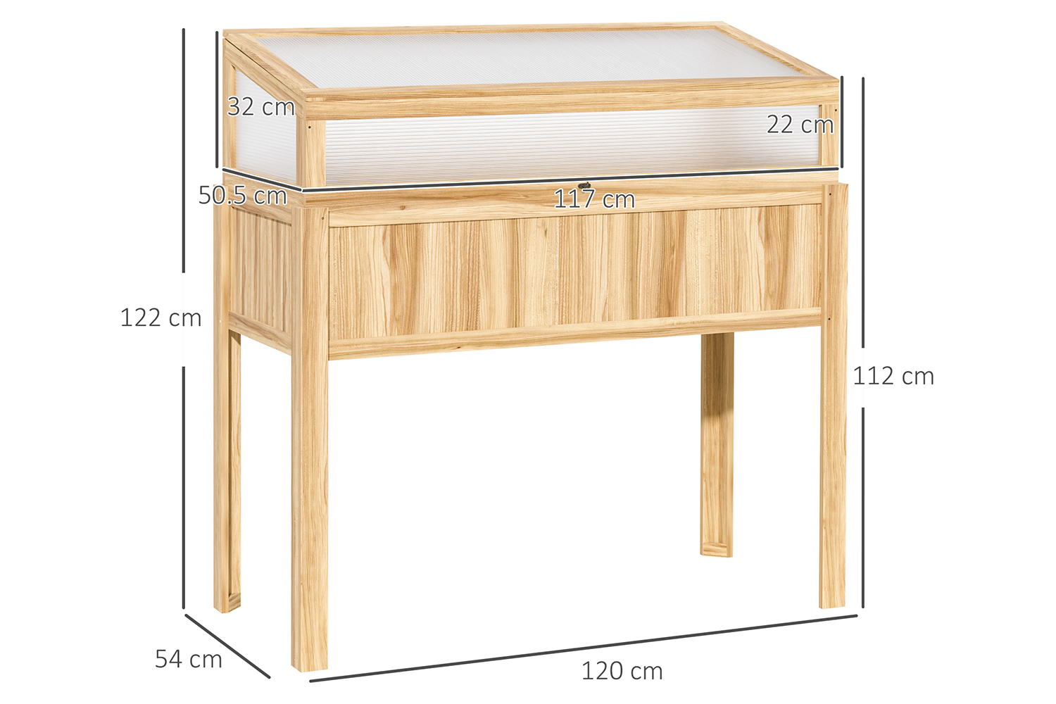 • Greenhouse size: 117L x 50.5W x 22/32H cm, inside planting size: 113W x 47D cm