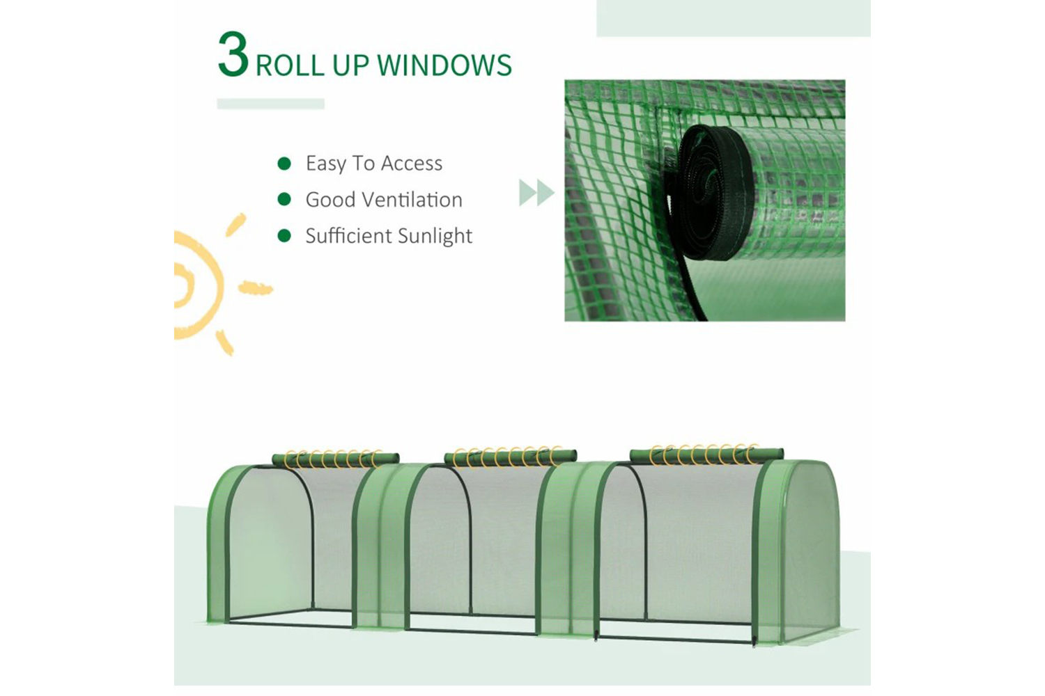 - Roll-up zipped doors for easy access and ventilation when needed