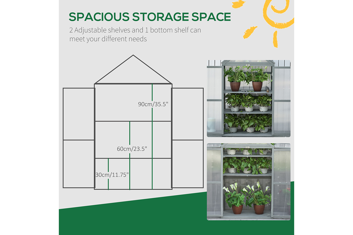 • Double doors with latches for easy management of plants