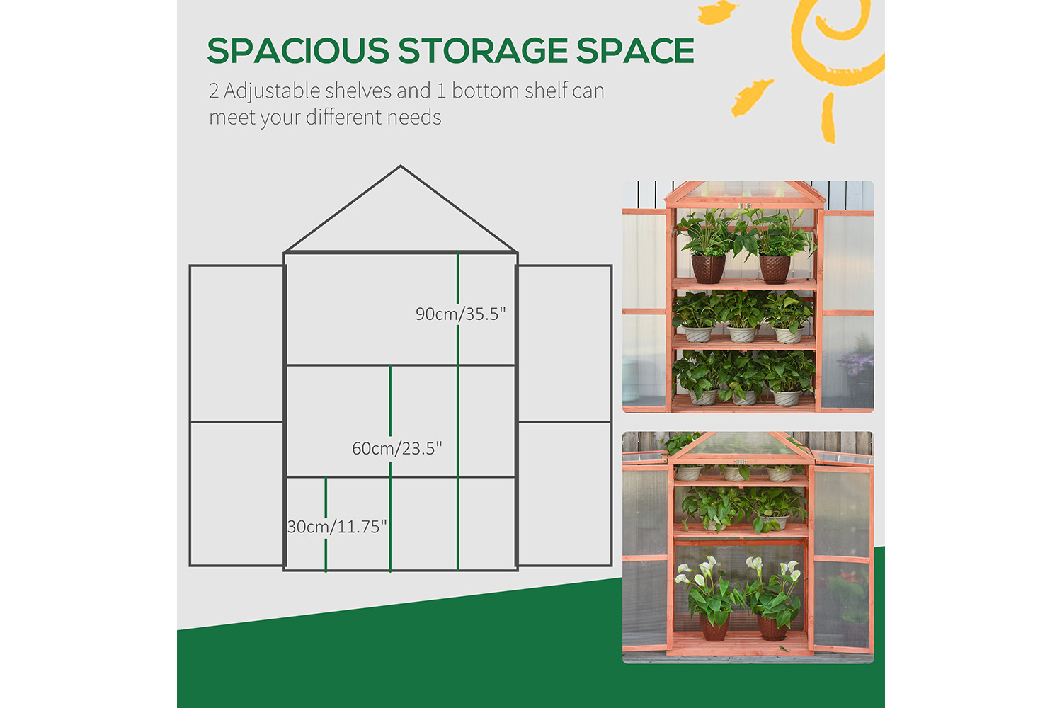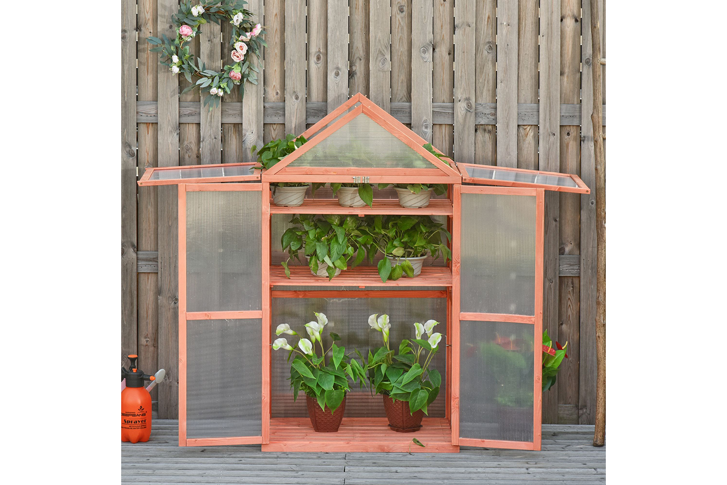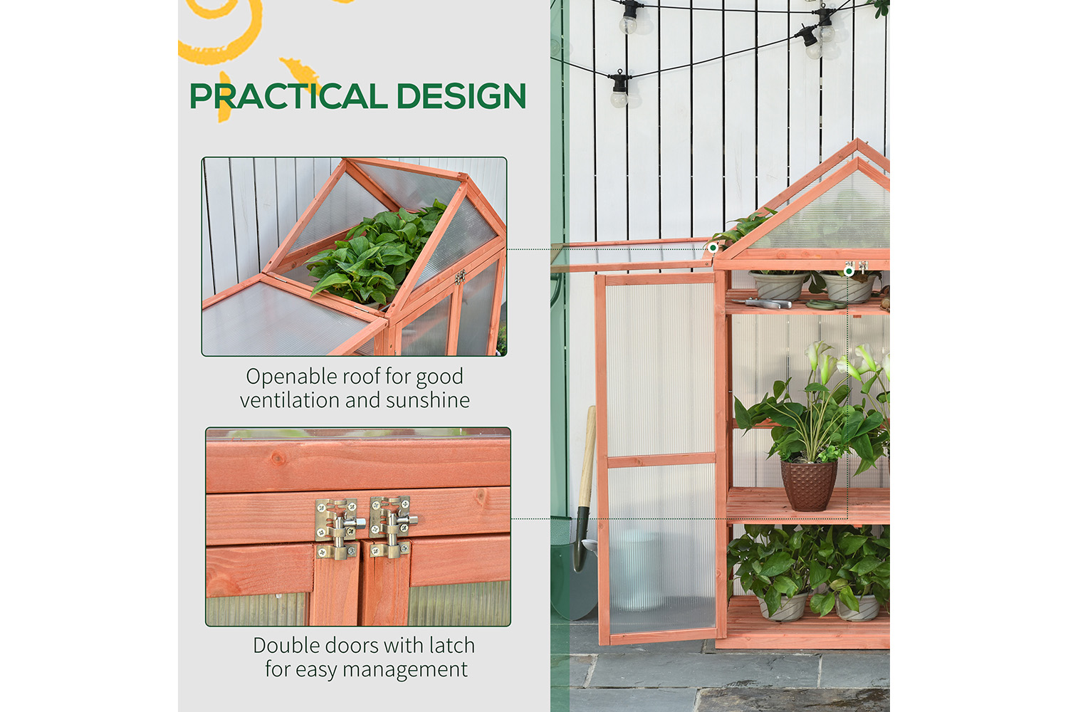This cold frame greenhouse from Outsunny can be a perfect choice for you to take care of your lovely plants. Solid wood frame for reliability. Transparent polycarbonate panels allow maximum light transmission while retaining heat for early seed sprouting or for protecting plants late in the season. Double doors and a 3-tier shelf make planting easier. This greenhouse provides an environment with an ideal temperature, your plants can enjoy the sunlight and grow healthily.