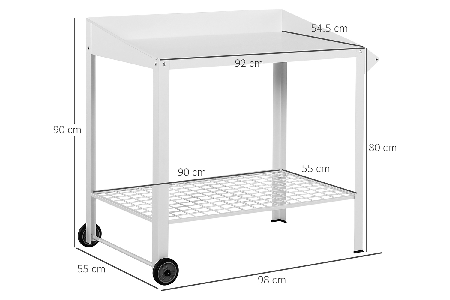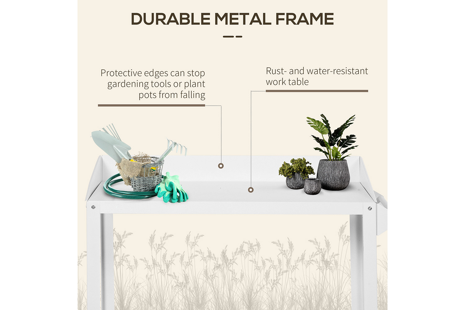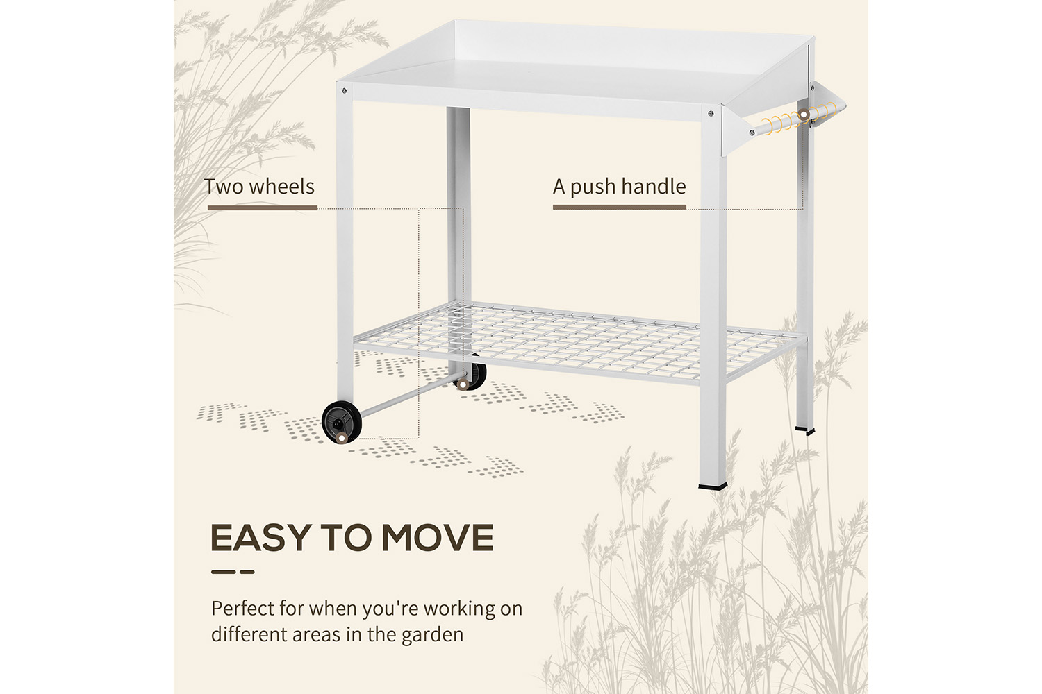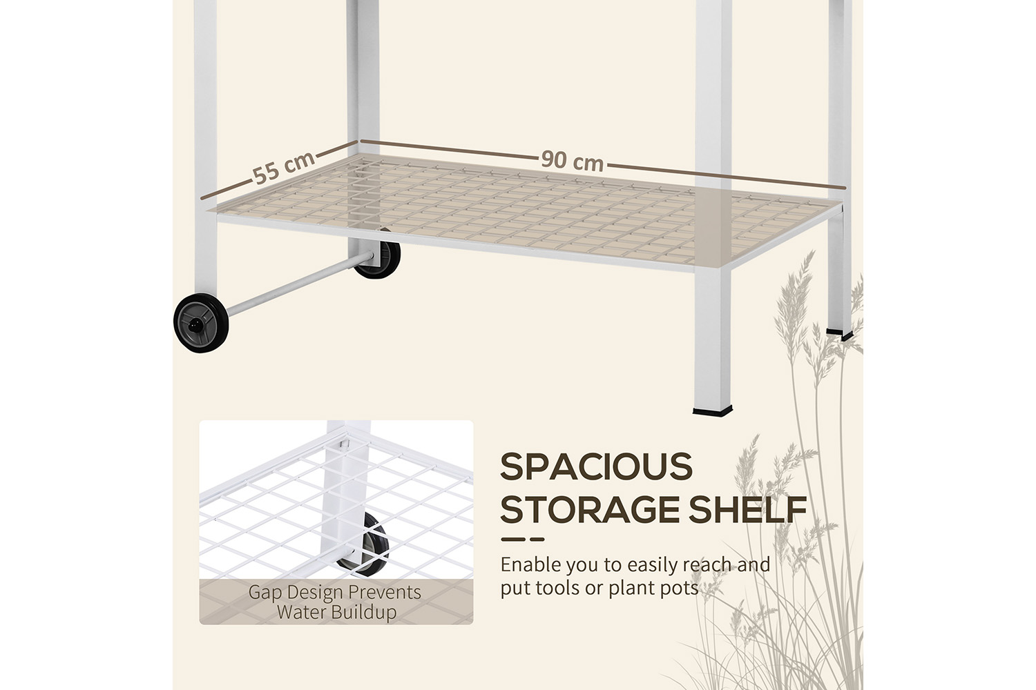• Features bottom mesh shelf, top shelf and side hook rail, providing plenty of room to work and store all your gardening essentials