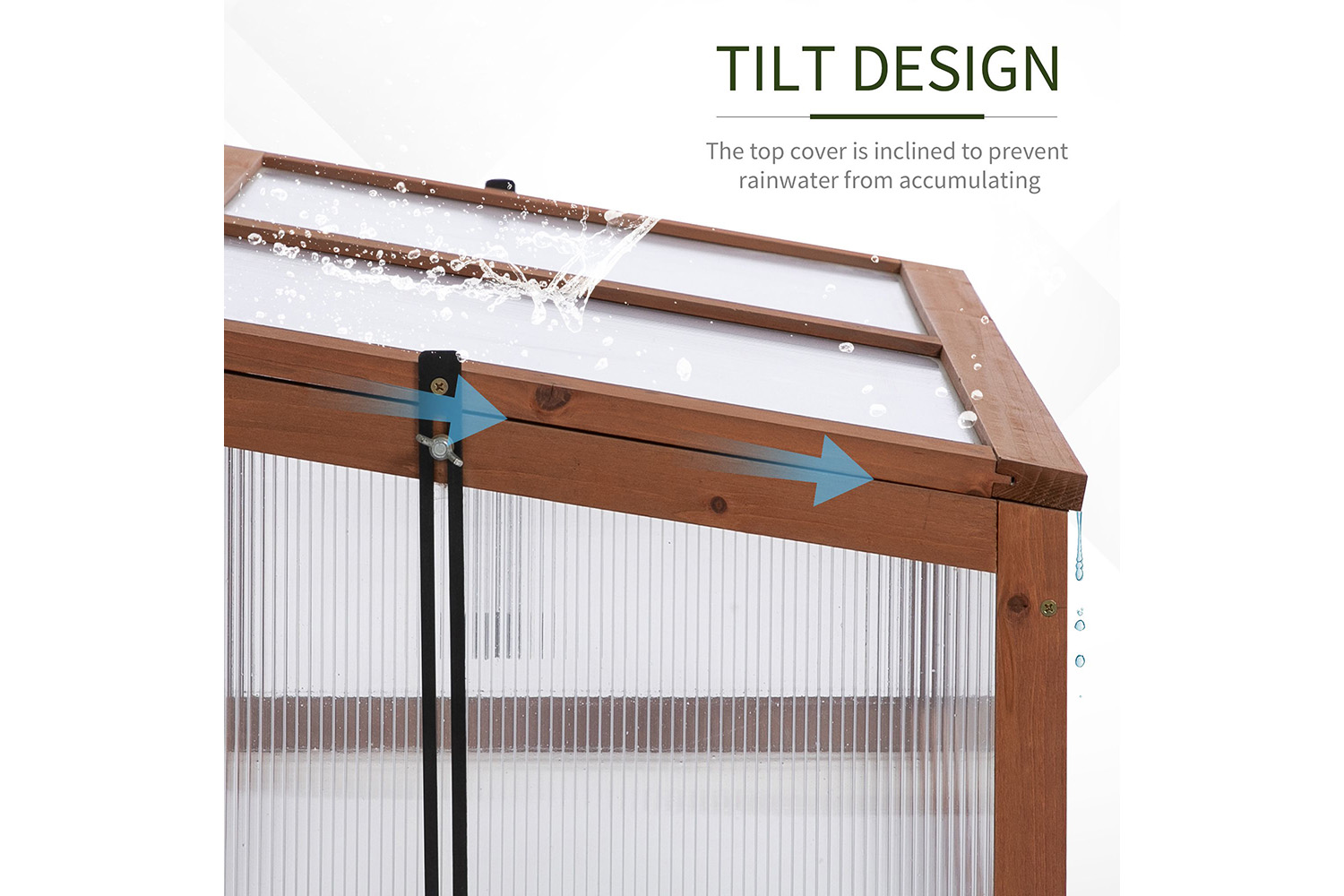 This wooden greenhouse from Outsunny with simple and rustic appearance can be a perfecct choice for you to take care of your lovely plants. High quality solid wood frame creates a reliable little house. Transparent polycarbonate panels allow maximum light transmission while retaining heat for early seed sprouting or for protecting plants late in the season. Openable cover for good ventilation in the greenhouse. This greenhouse provides an environment with ideal temperature, your plants can enjoy the sunlight and grow healthily.