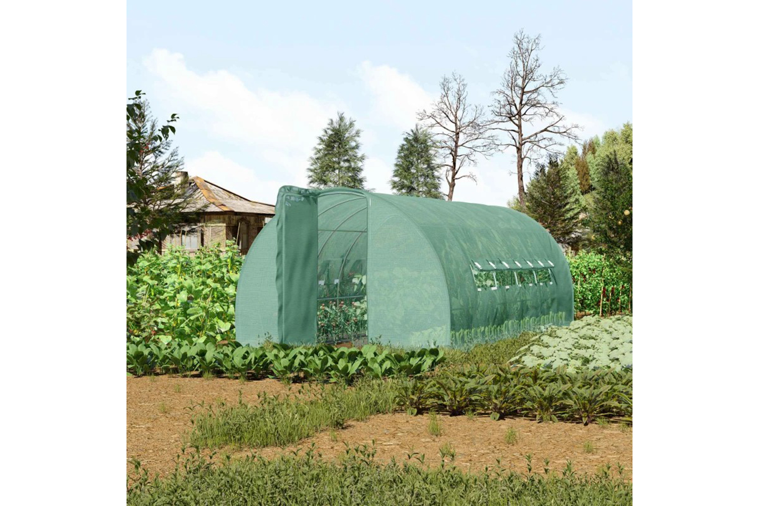 - Hinged door provides easier access for gardeners to enter this greenhouse