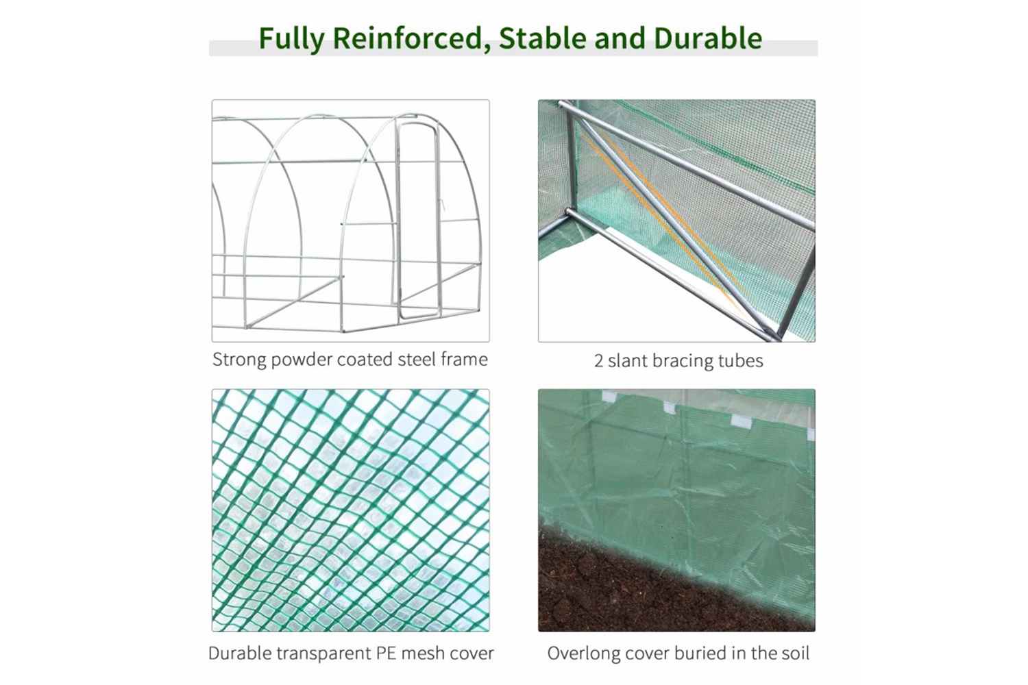 - Built form steel tube frame and PE cloth in "tunnel" style