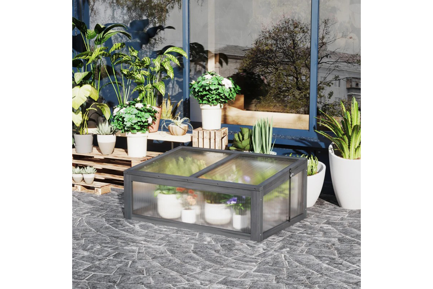 This wooden greenhouse from Outsunny with simple and rustic appearance can be a perfecct choice for you to take care of your lovely plants. High quality solid wood frame creates a reliable little house. Transparent polycarbonate panels allow maximum light transmission while retaining heat for early seed sprouting or for protecting plants late in the season. Openable cover for good ventilation in the greenhouse. This greenhouse provides an environment with ideal temperature, your plants can enjoy the sunlight and grow healthily.