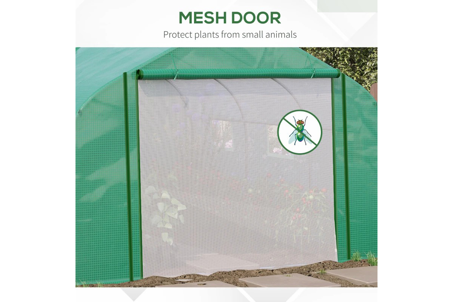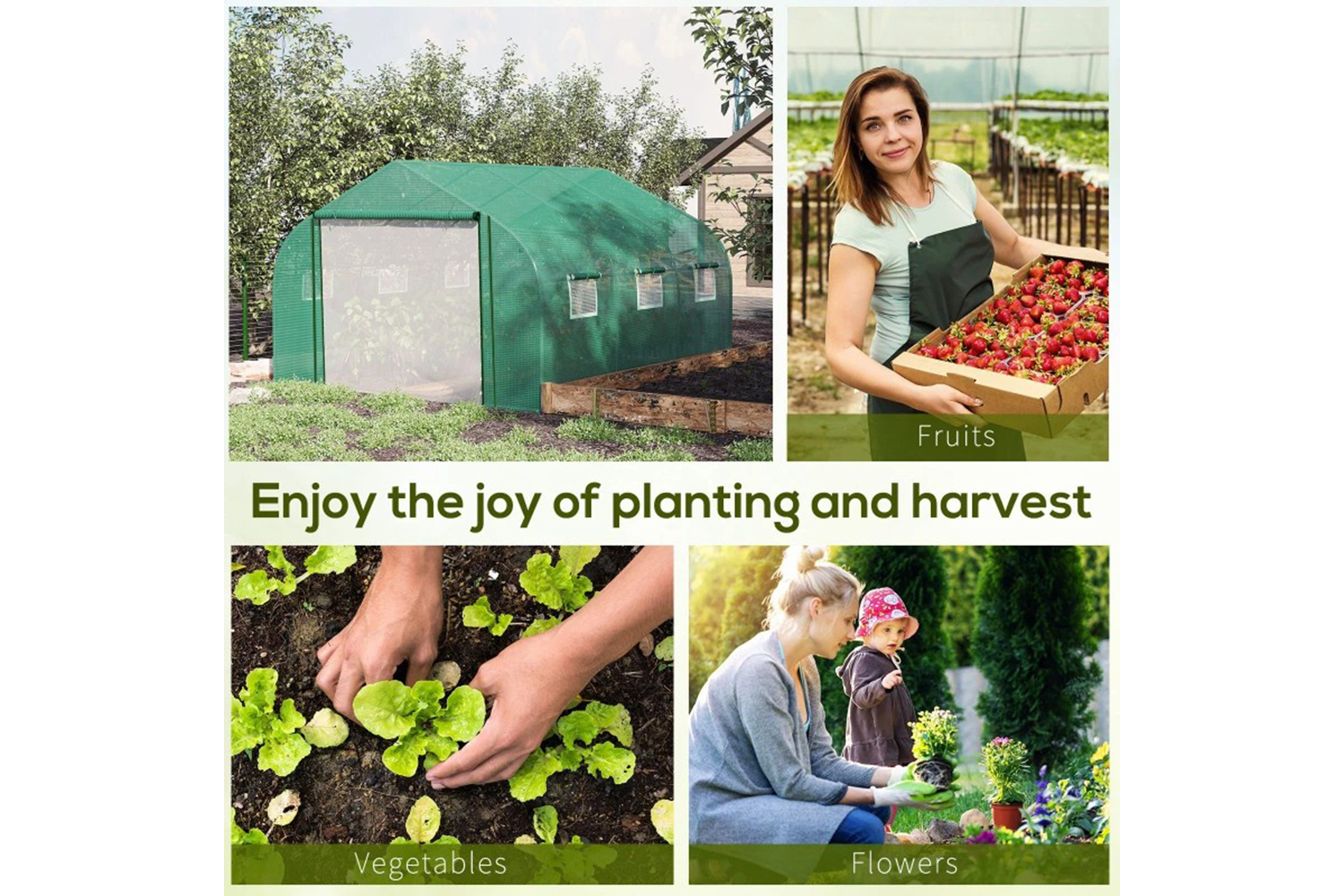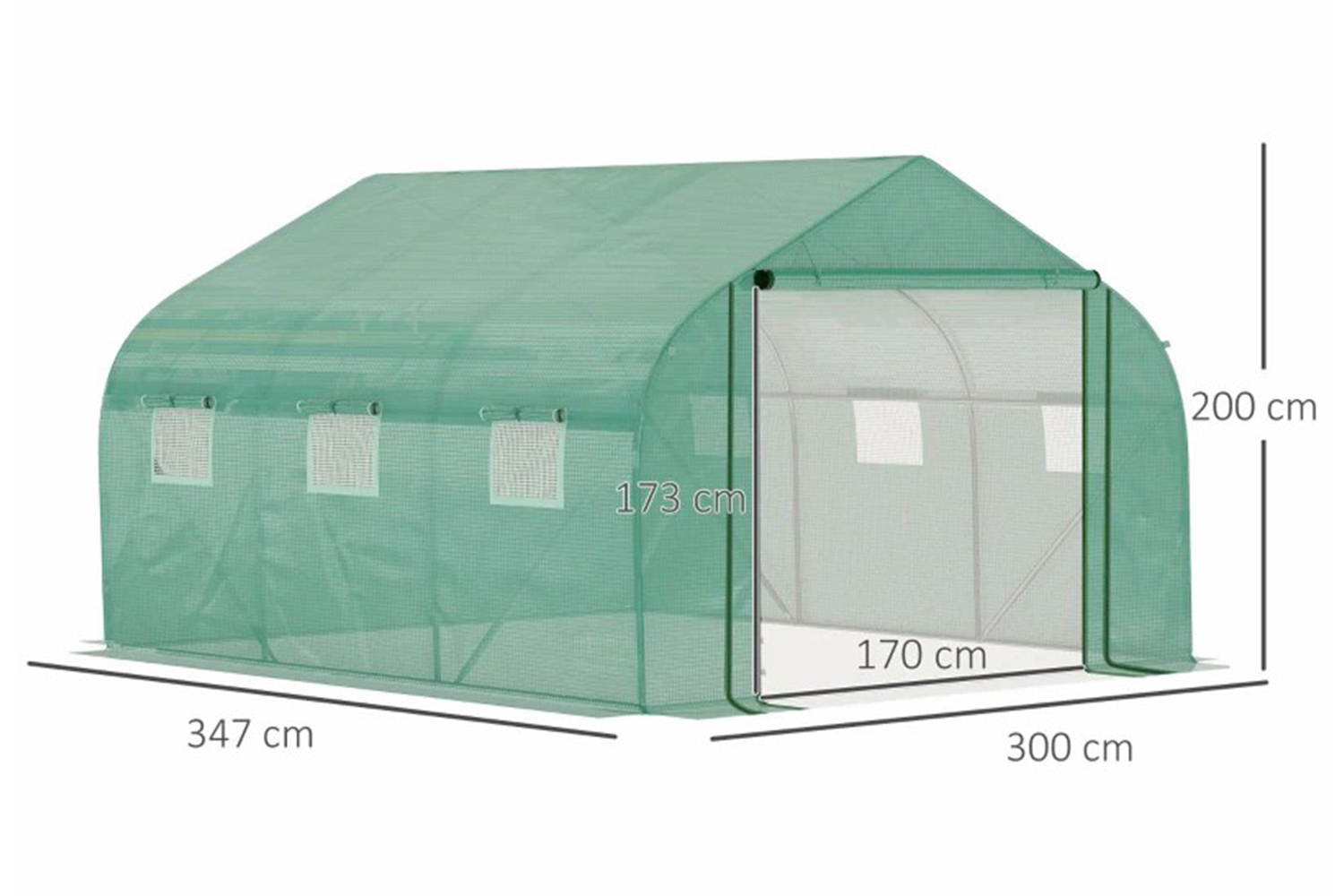This Outsunny 11x10ft plant greenhouse is perfect for every gardening enthusiast, who is looking for a way to stay in the soil all year round! The garden polytunnel greenhouse offers all the protection your plants need to thrive without having to spend a great deal of green yourself. The steel frame and PE cover create a safe, protective shelter for all your plants. The six windows, with netting, allow fresh air inside, whilst the roll-up door gives easy access.
