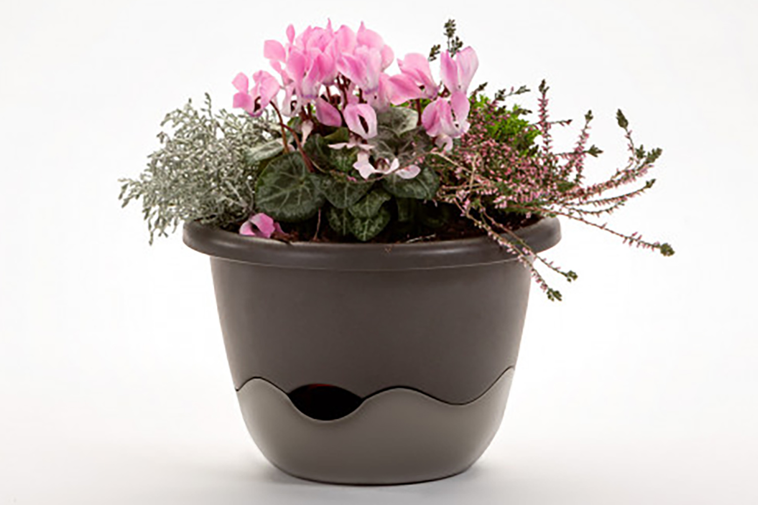 The circular shape and color selection of the upper and lower part allow the assembly of a range of colorful combinations. The pot can be placed on a terrace or in a garden; integrated slots make it easy to hang.