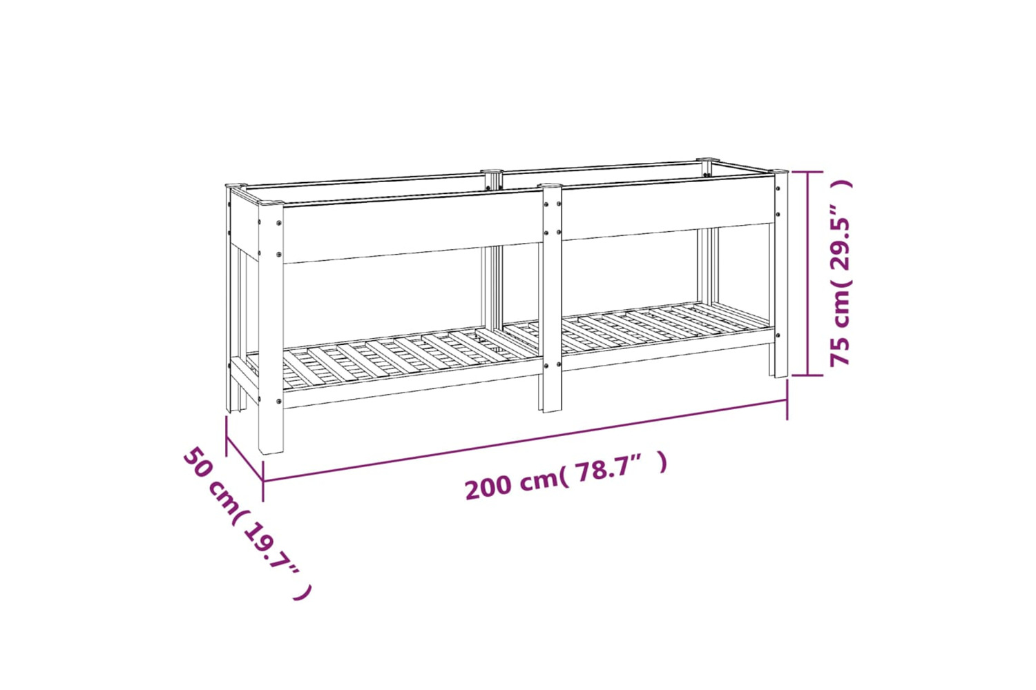 - Inside dimensions of planter box: 194.5 x 44 x 14 cm (L x W x H)