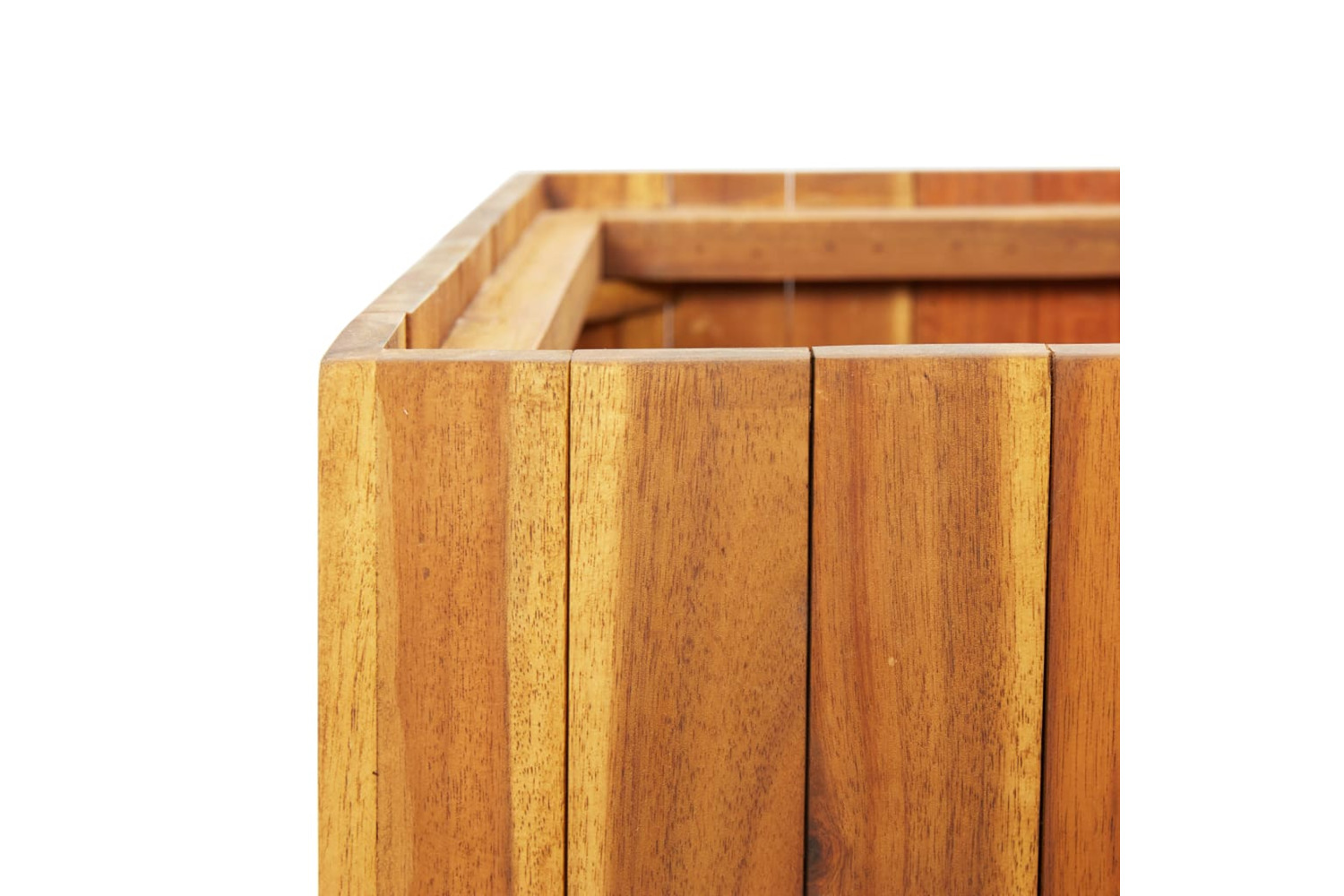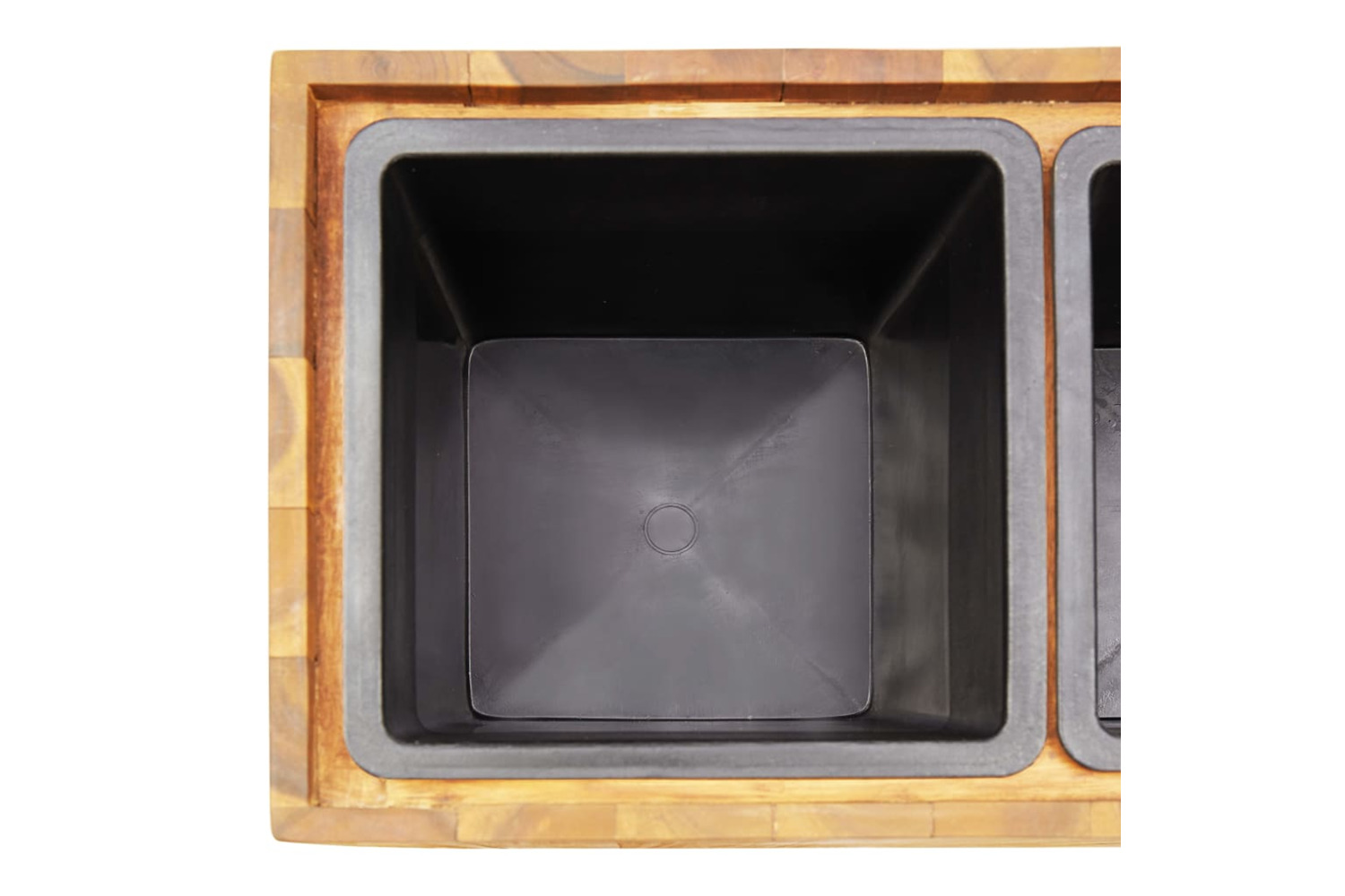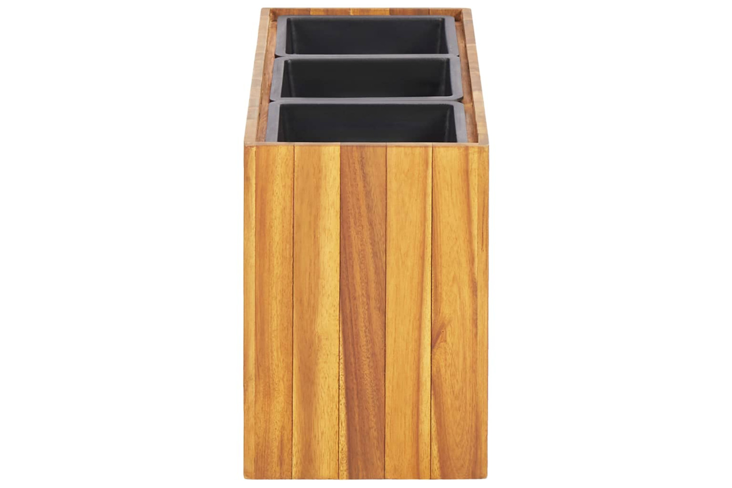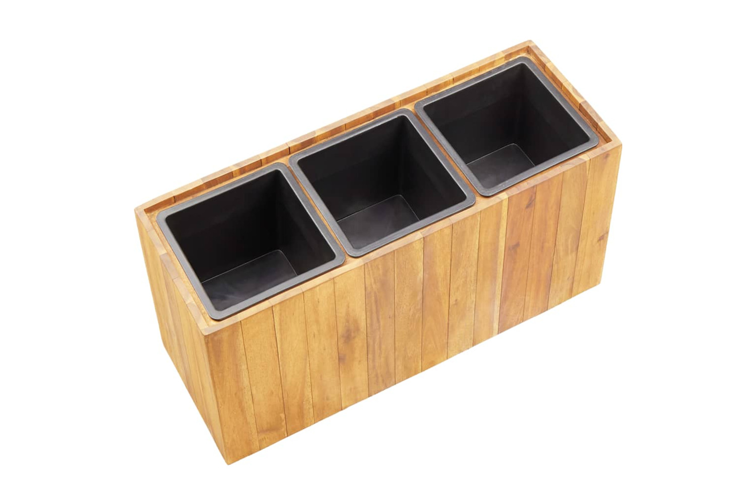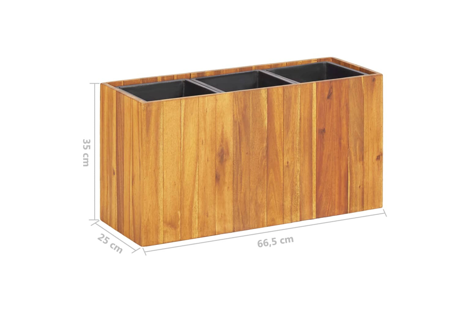 Made of solid acacia wood in a natural oil finish, this planter pot is weather resistant and therefore very practical for outdoor use all year around. The planter is deep and wide enough to hold a large amount of soil as well as provide ample space for your plants. The three included plastic pots allow for easy arrangement of your flowers, herbs, vegetables and more.