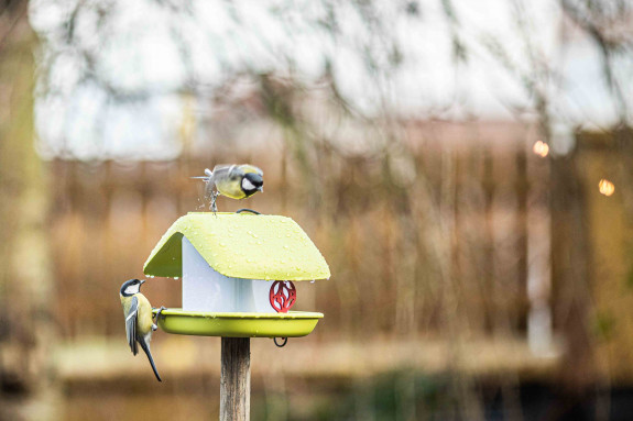 Feeders for wild birds; they can be hung on a tree or terrace, or attached to railings or poles. Maintenance and refilling are both very easy. Volume 0,8 litre.