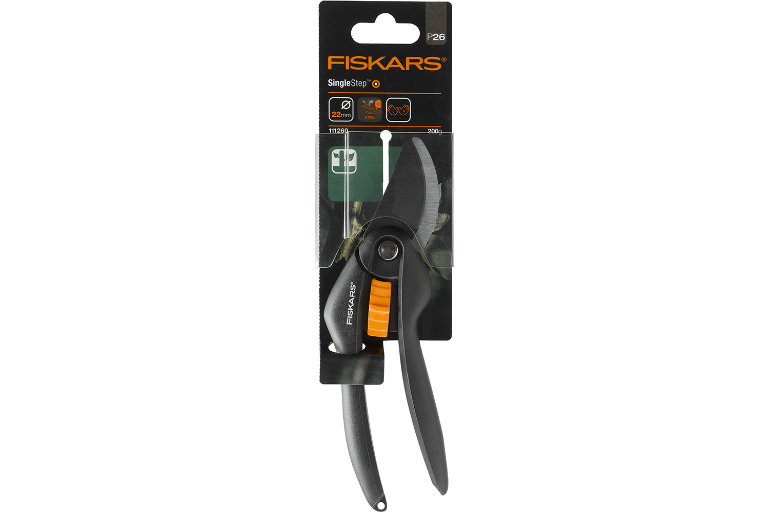 • The Fiskars SingleStep Bypass Pruner P26 gives you a simple and more effective way to prune branches and trim trees.