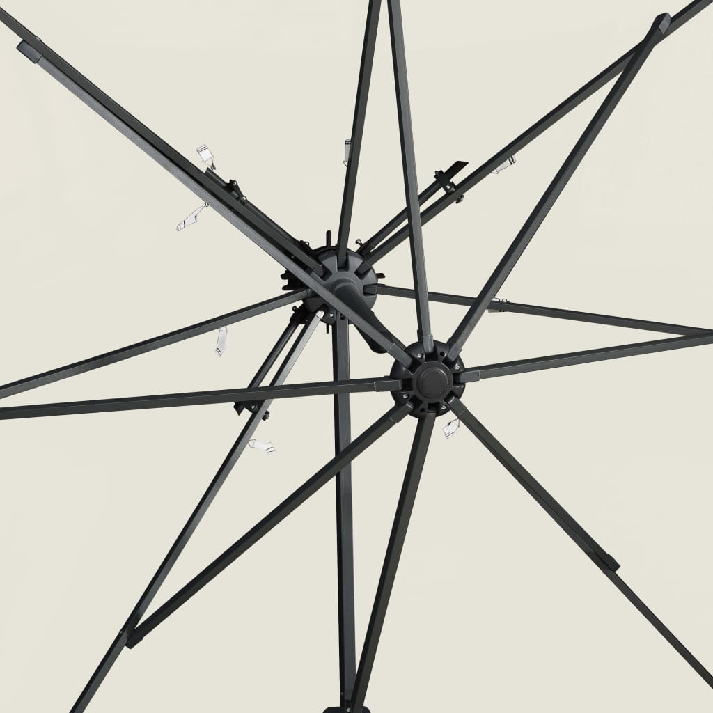 Made of UV protective and anti-fade polyester, the parasol cover provides you with optimum protection against the sun and is easy to clean. It features a sturdy cross base to add stability. The exclusive design of this parasol allows you to tilt and rotate it in 360 degrees to block the sun. The strong aluminium pole, along with the 8 ribs, makes the parasol very stable and durable. This garden umbrella can be easily opened and closed thanks to the crank mechanism. Additionally, the double-top design canopy helps ventilation.