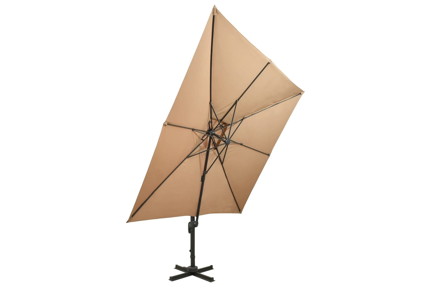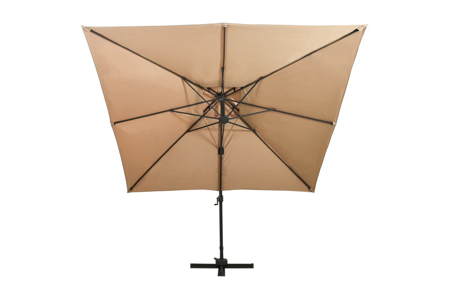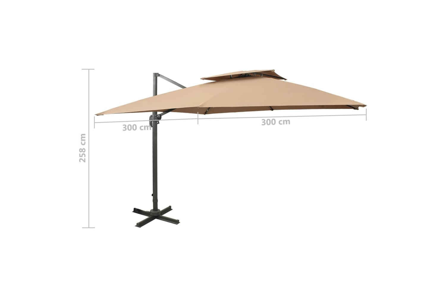 Made of UV protective and anti-fade polyester, the parasol cover provides you with optimum protection against the sun and is easy to clean. It features a sturdy cross base to add stability. The exclusive design of this parasol allows you to tilt and rotate it in 360 degrees to block the sun. The strong aluminium pole, along with the 8 ribs, makes the parasol very stable and durable. This garden umbrella can be easily opened and closed thanks to the crank mechanism. Additionally, the double-top design canopy helps ventilation.