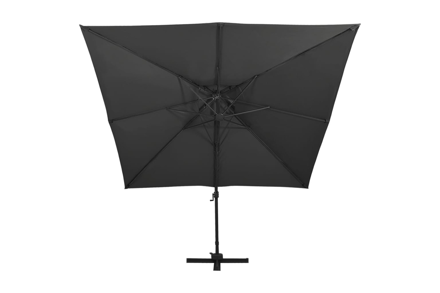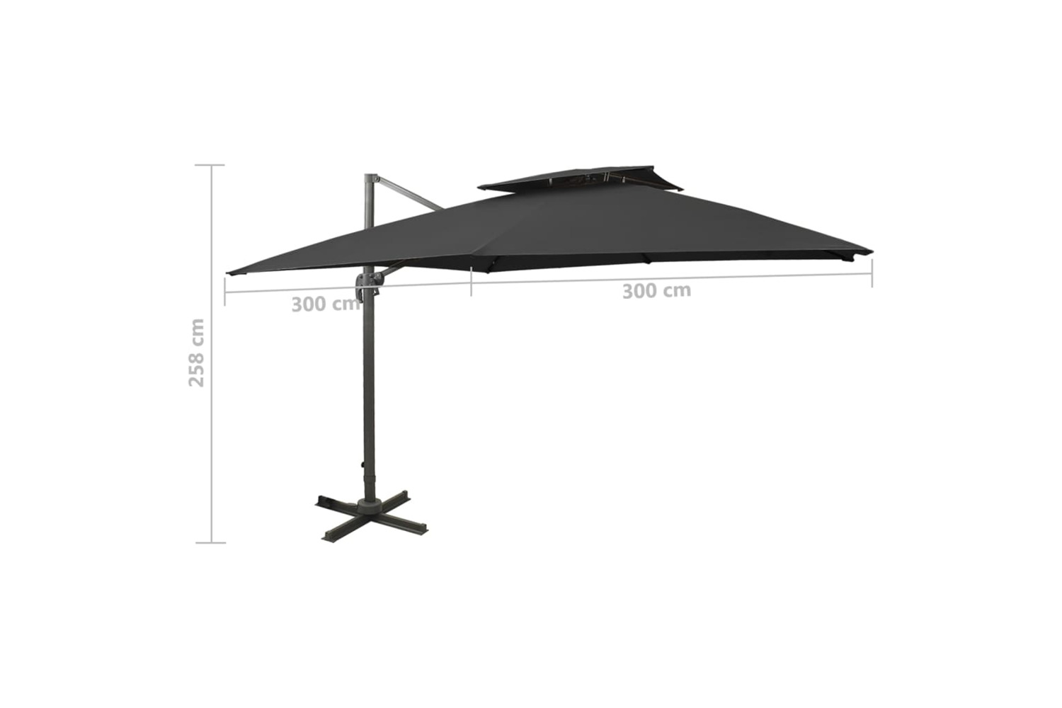 Made of UV protective and anti-fade polyester, the parasol cover provides you with optimum protection against the sun and is easy to clean. It features a sturdy cross base to add stability. The exclusive design of this parasol allows you to tilt and rotate it in 360 degrees to block the sun. The strong aluminium pole, along with the 8 ribs, makes the parasol very stable and durable. This garden umbrella can be easily opened and closed thanks to the crank mechanism. Additionally, the double-top design canopy helps ventilation.