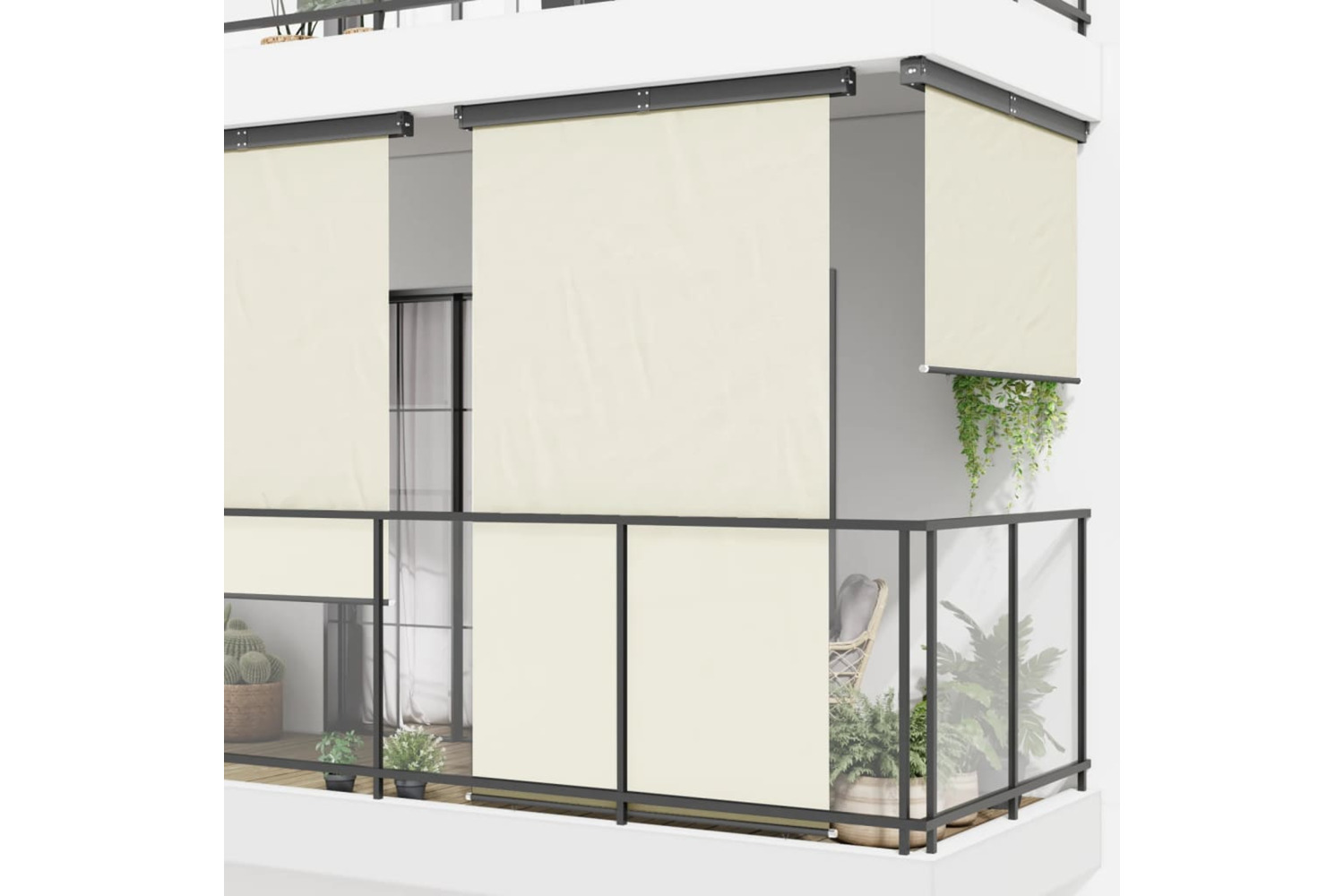 The screen is made of UV resistant, tear resistant polyester. The aluminium roller ensures smooth rolling. It features self-locking function so that it can stop at any place. The awning can retract back to steel cassette automatically just by pulling bottom triangle rings. In addition, this balcony vertical awning can be both fixed on the wall or ceiling according to specific needs.
