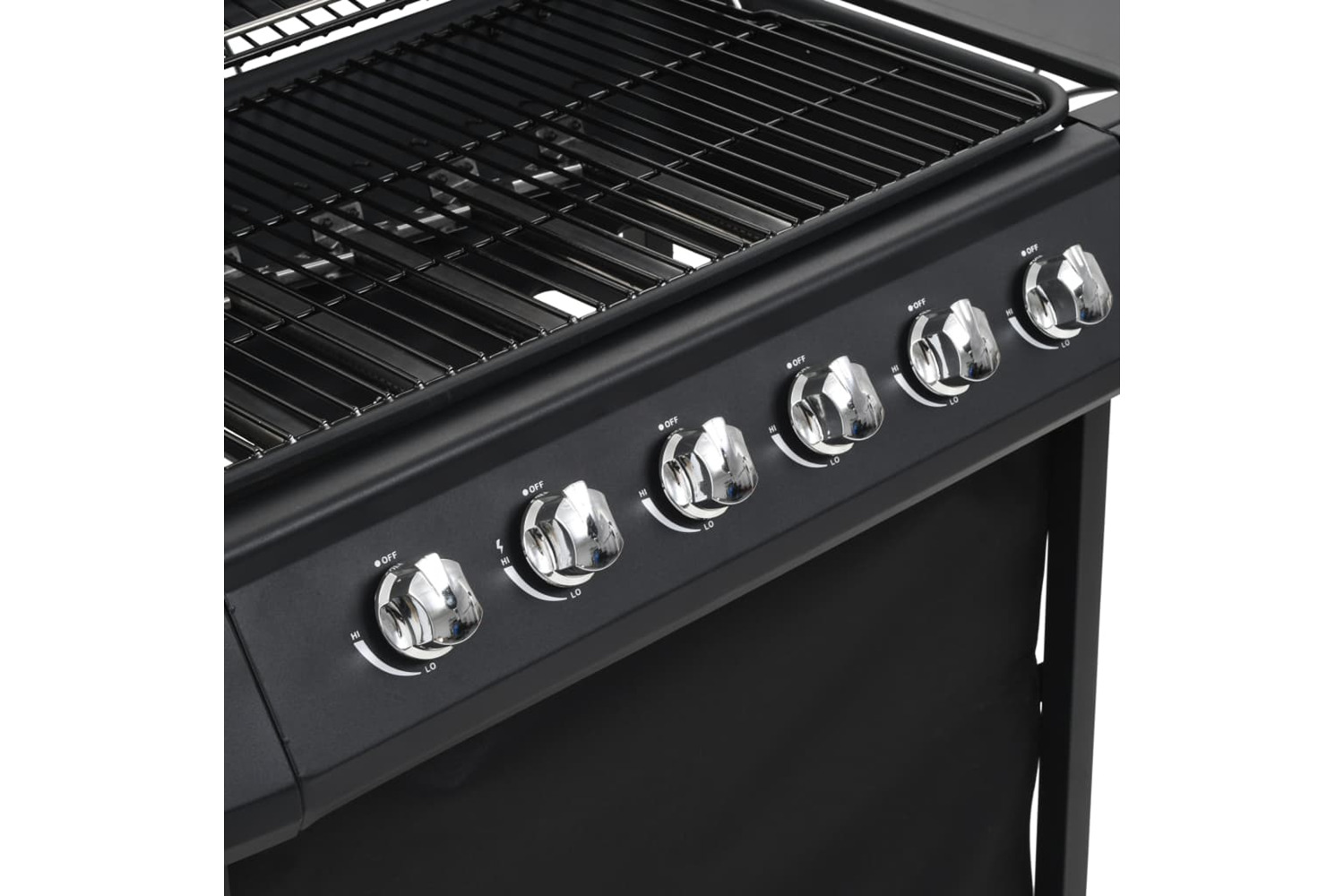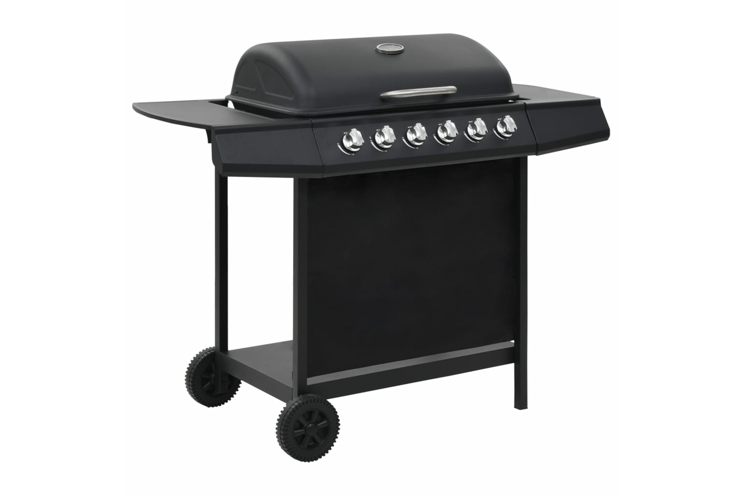 The gas grill features a stylish and functional design. It has 6 burners and a heavy-duty hood with a built-in thermometer which accurately displays the cooking temperature. Two side panels offer additional space for making sauces or your favourite side dishes. A removable grease drip container is also included, which is easy to clean. Made of heavy-duty materials, the grill is very durable. The cabinet underneath provides large space to store other supplies. Thanks to the 2 sturdy castors, the grill is easy to move around. Delivery also includes a BBQ cover to protect the grill from rain and dust. To connect the barbecue to the gas cylinder, a gas hose and a proper pressure regulator are required, which are not included in delivery.