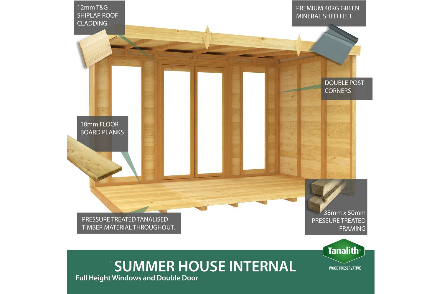 Enjoy an abundance of natural light with the full height window design, creating a bright and inviting atmosphere inside. Choose from single or double door options and various window placements to suit your garden layout and personal preferences. The pressure treated timber not only enhances the natural beauty of the wood but also offers superior protection against rot, fungal decay, and insect attack, ensuring your summer house remains a stunning feature for years to come.