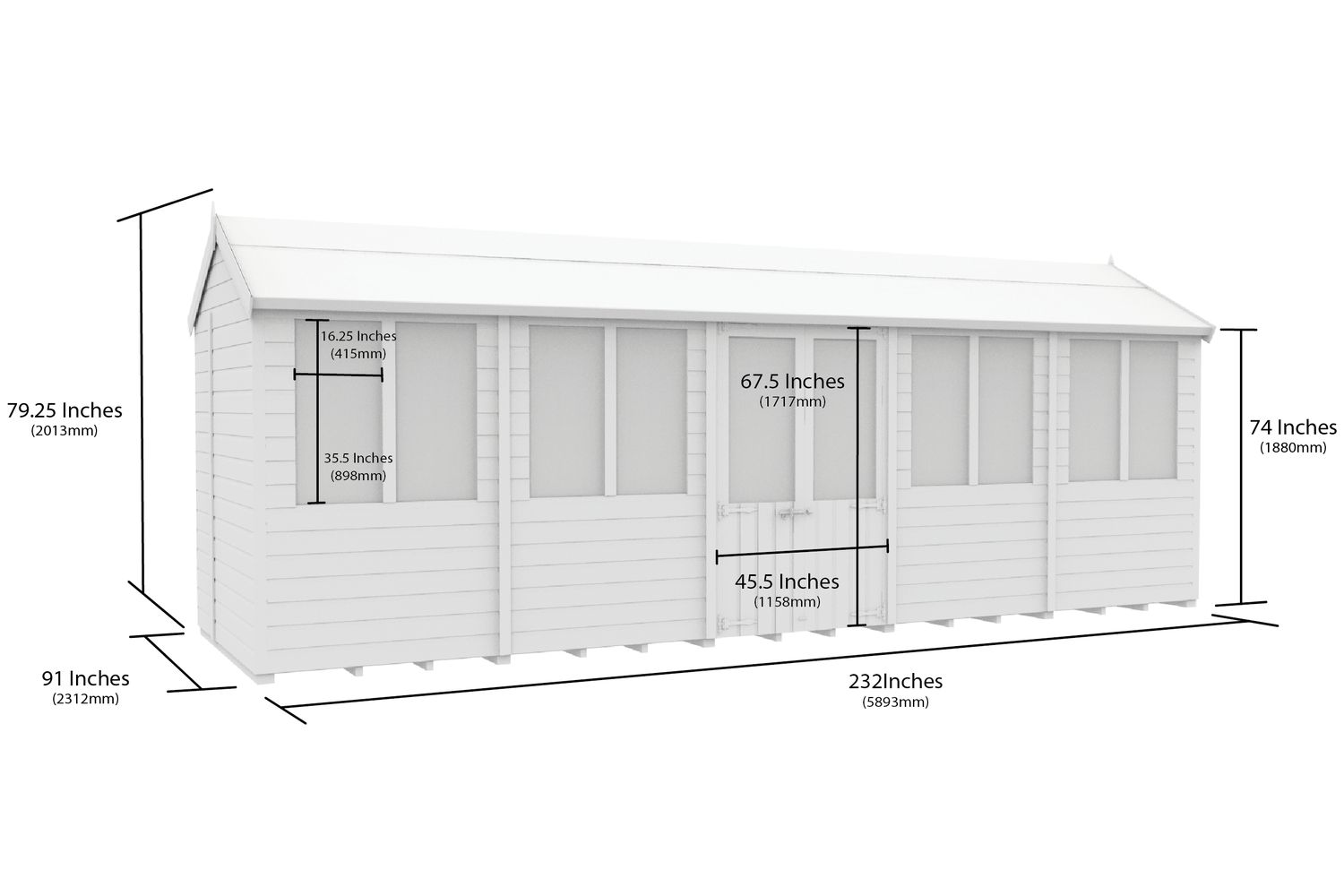 - Spacious 20ft x 8ft apex roof design for maximum headroom and water drainage