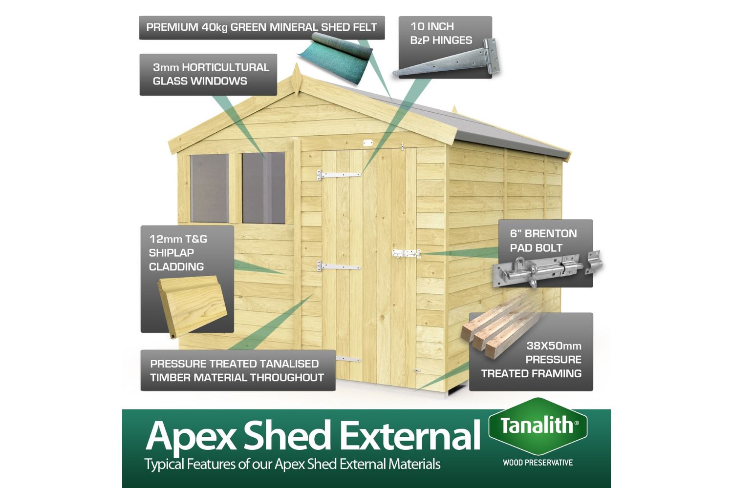 Constructed from premium 12mm Swedish pressure treated tanalised red-wood, this shed offers superior protection against rot, fungal decay, and insect attack. The 38mm x 50mm framework throughout the structure provides exceptional strength and stability, while the heavy-duty 18mm floor is engineered to support heavier items with ease. Floor bearers elevate the shed off the ground, offering extra moisture protection and prolonging the life of your investment.