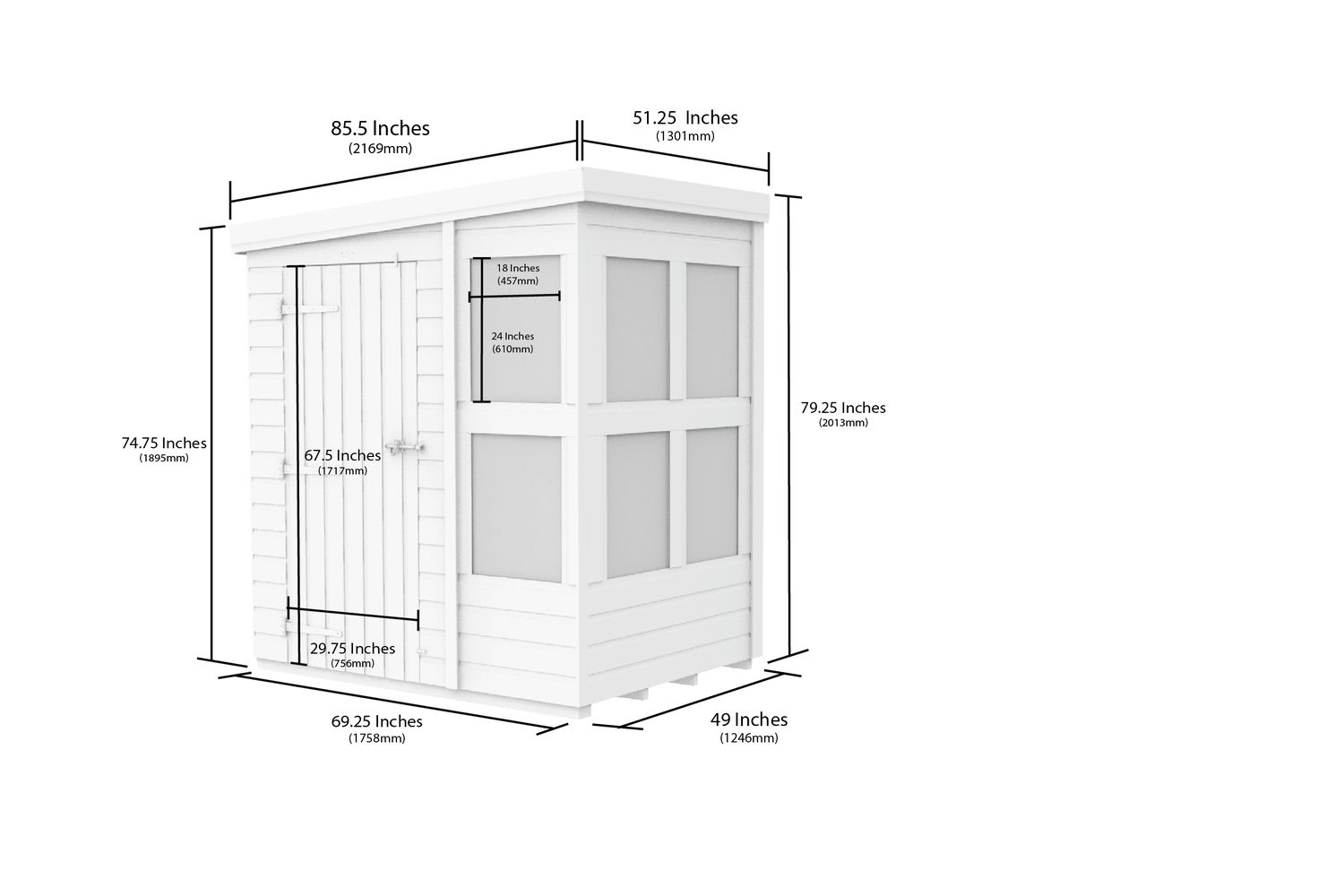 - Roof: Pent, single sloping for drainage