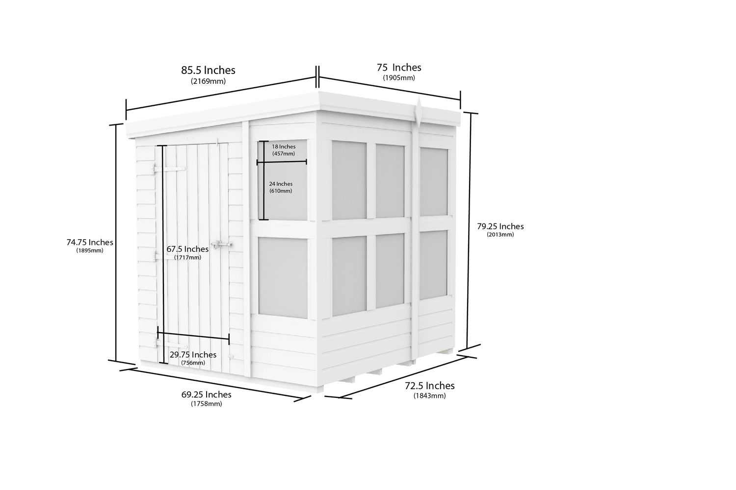 - Roof: Pent, single slope