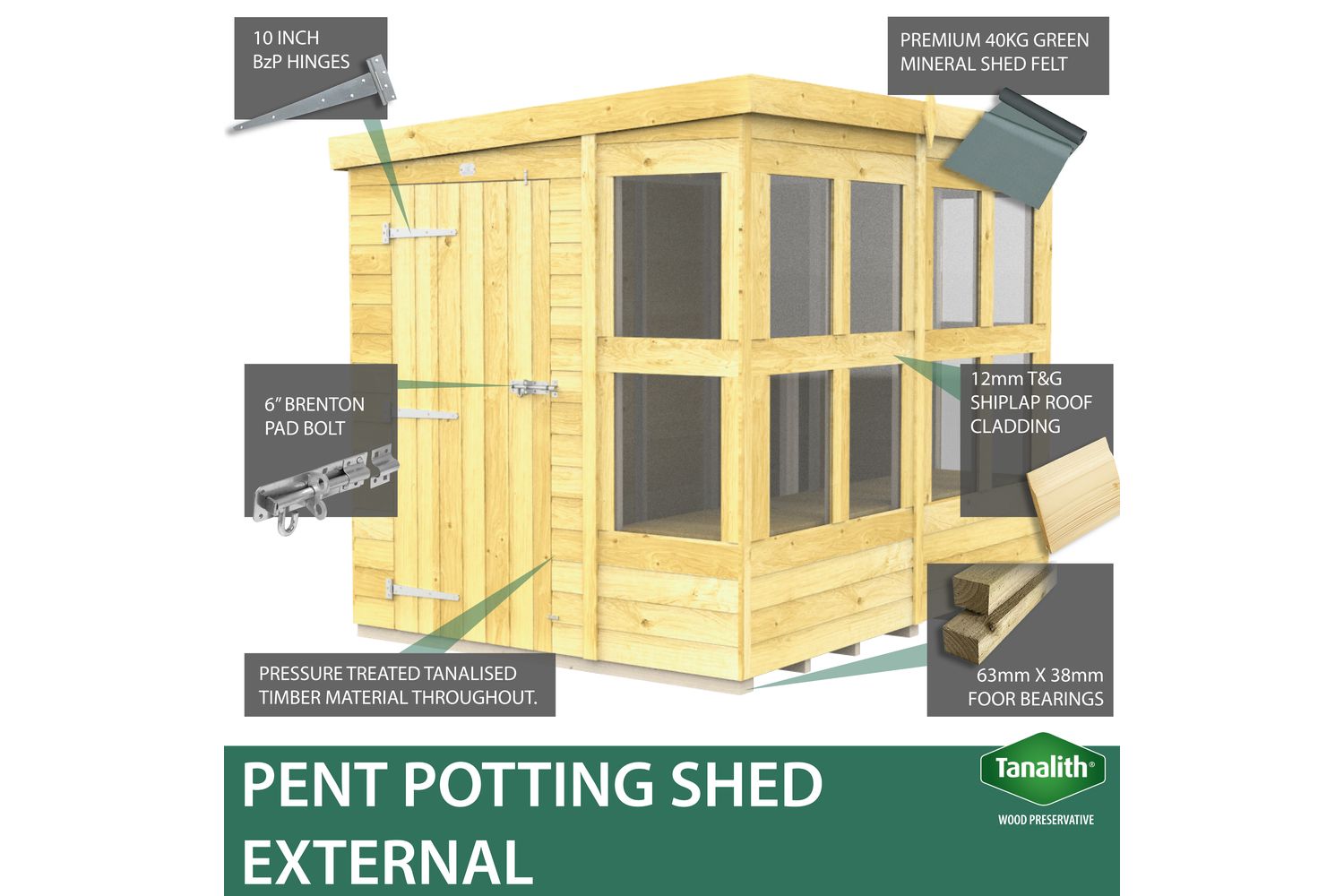 Enjoy a bright and airy workspace with flexible window placement options, allowing you to maximise natural light for your plants or projects. The single sloping pent roof ensures efficient water drainage, preventing leaks and water damage. For added security and peace of mind, the shed comes with galvanised hinges and a Brenton padbolt as standard.
