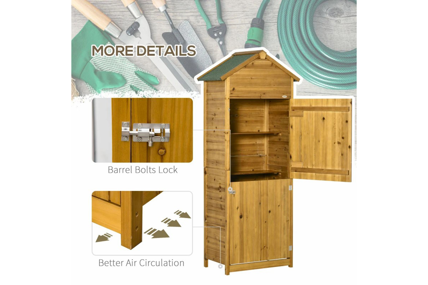 This tall and narrow garden shed, from Outsunny, is ideal for those limited on space. Made from fir wood, the structure is strong and durable, suitable for outdoor use. Inside it features two removable shelves: flexible room for your tools and more. The sloped roof with asphalt covering helps keep inside dry. Complete with a double-opening door with bolt lock.