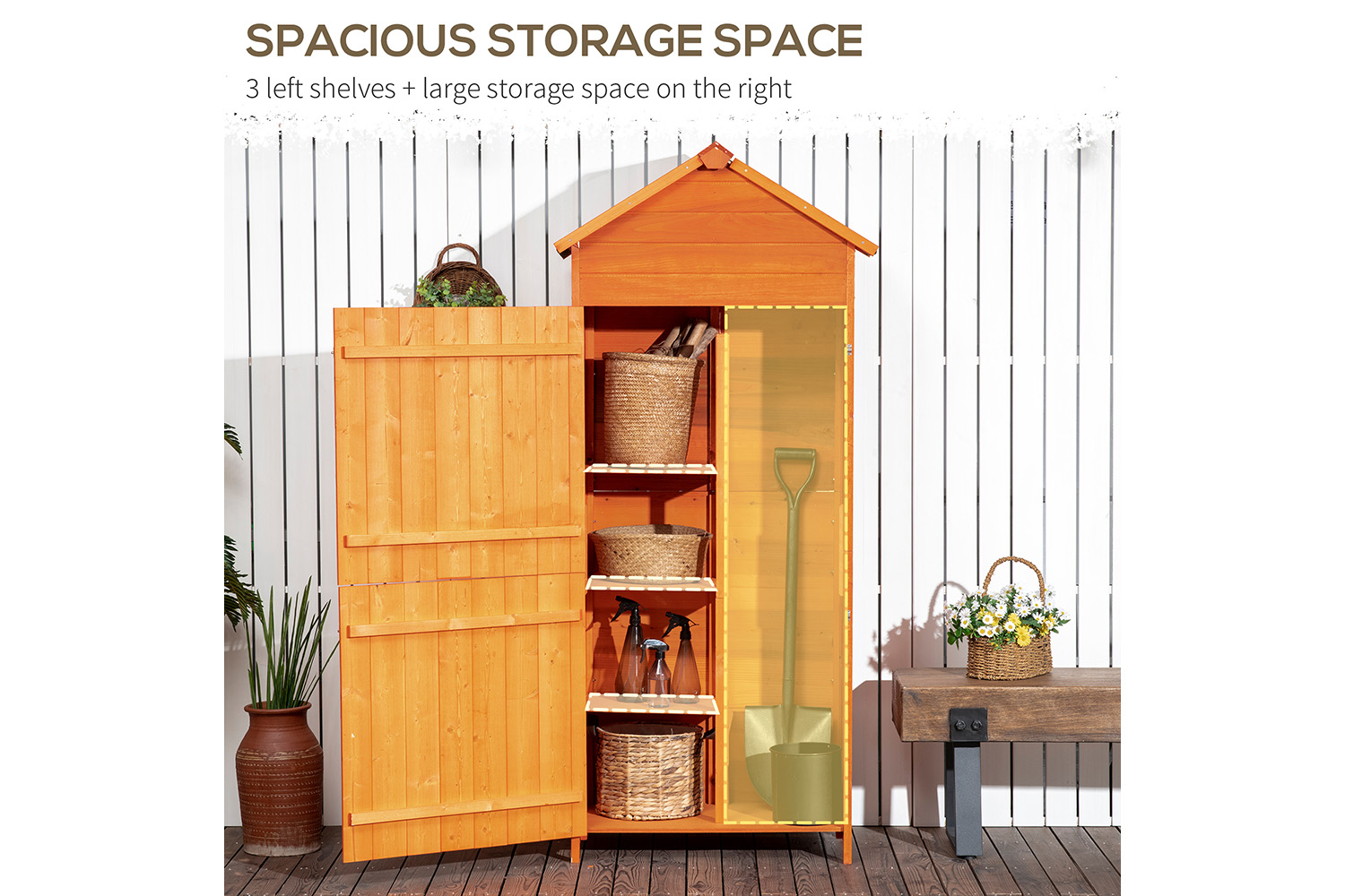 This Outsunny garden storage utility is a great place for you to store your tools and accessories for the garden. This vertical storage shed offers plenty of space, with a plit system of one side with shelves for smaller items and the other side to store large and long items. Made from fir wood and offering 3 shelves. The tool shed comes with 2 doors which can be opened separately, and a has an apex roof design. TA great item to have in your garden and a great place to store.