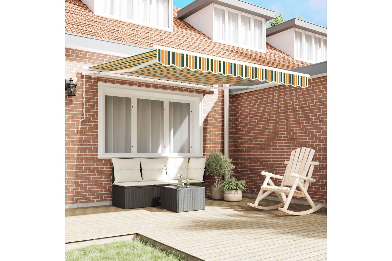 This Manual Retractable Awning is a top-notch addition to any outdoor area, giving you both shade and style for your balcony, patio, or garden. It’s got a modern, simple vibe with clean lines and not too much fuss, blending in nicely with any contemporary outdoor space. The green and yellow stripes add a fun touch that really brightens up your outdoor area. Whether you’re after a cool spot to relax or need to keep your furniture safe from the sun, this awning combines practicality with great looks.
