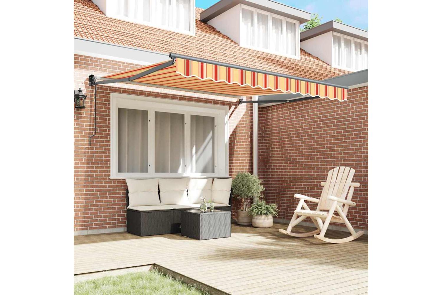 The Retractable Awning adds a sophisticated touch to any outside space, combining style and function for your patio or balcony. With its modern rectangular shape and lively striped patterns in yellow and orange, it creates a warm and inviting vibe, just right for summer relaxation.