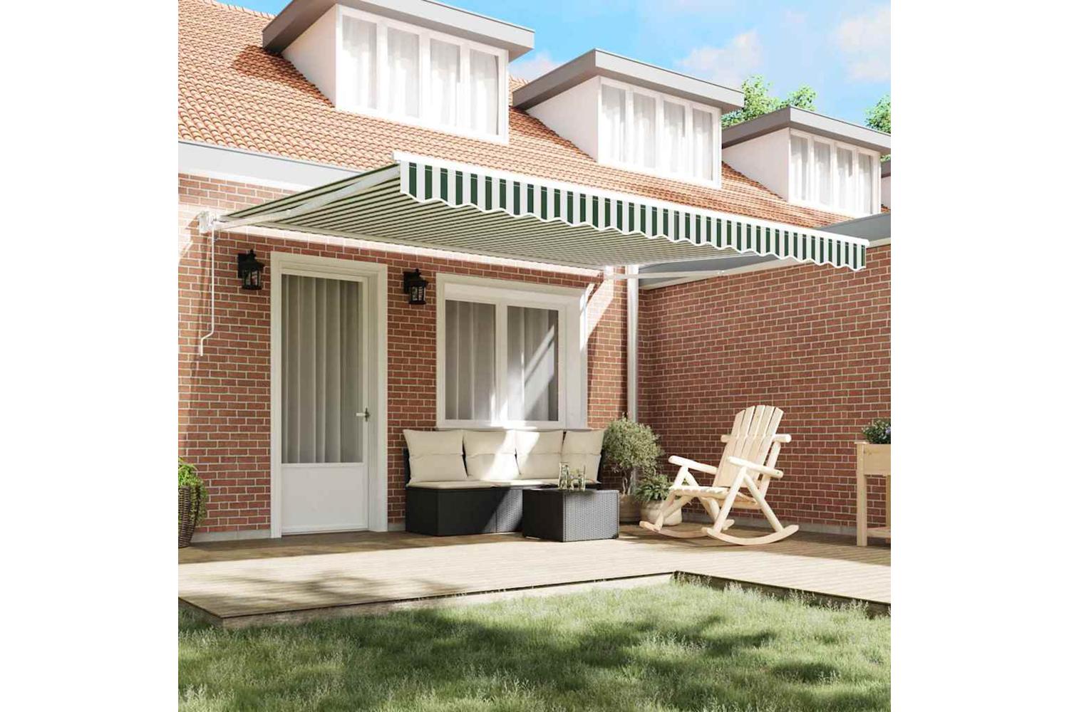 Durable Polyester This awning is made from tough polyester, known for its solid performance in all kinds of weather. Its UV-resistant qualities shield it from sun damage, ensuring it lasts and doesn’t fade, even after being in direct sunlight for ages. Aluminium Frame With a strong aluminium frame, this retractable awning gives you all the stability you need. It's lightweight but sturdy, making it great for outdoor setups while standing strong during breezy days. Easy to Retract Designed for flexibility, you can smoothly extend or retract the awning with ease. This means you can adjust the shade to fit what you need, ensuring optimal comfort throughout the changing seasons. Charming Stripes The classic striped look in green and white brings a touch of elegance to your outdoor space. Not only does it look good, but it also adds a lively and cheerful vibe to your garden or patio. Easy Care Keep the awning looking great by avoiding direct sun when it’s not in use and using protective covers. This simple care routine, along with occasional waterproofing, helps keep it in tip-top shape for ages.