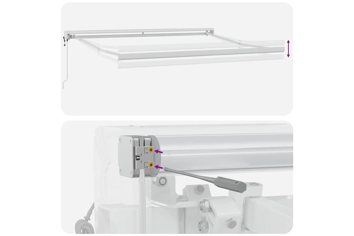 This appliance can be used by children aged from 8 years and above and persons with reduced physical, sensory or mental capabilities or lack of experience and knowledge if they have been given supervision or instruction concerning use of the appliance in a safe way and understand the hazards involved. Children shall not play with the appliance. Cleaning and user maintenance shall not be made by children without supervision. If the supply cord is damaged, it must be replaced by the manufacturer, its service agent or similarly qualified persons in order to avoid a hazard. WARNING: Important safety instructions. It is important for the safety of people to follow these instructions. Save these instructions. WARNING: Important safety instructions. Follow all instructions since incorrect installation can lead to severe injury or even death. Do not allow children to play with the control device. Keep remote control away from children. Do not operate the awning when maintenance, such as window cleaning, is being carried out in the vicinity. Moving parts of the drive must be installed higher than 2.5m above the floor or another level that could provide access to it. Before installing the drive, remove any unnecessary cords and disable any equipment not needed for powered operation. The actuating member of a biased-off switch is to be located within direct sight of the driven part, but away from moving parts. It is to be installed at a minimum height of 1.5m. Danger! Strong spring when opens. DO NOT remove this rope unless you have finished all of the assembly steps with all bolts are fastened and the item is attached to the wall! Warning! Take care when loosening the arms, because they are under tension! A sudden release of the arm of a folding arm awning can cause injury. Warning: The operator’s instruction shall be read before the use of the product. Warning: The operation in frosty conditions may damage the product. External use in buildings and other construction works.