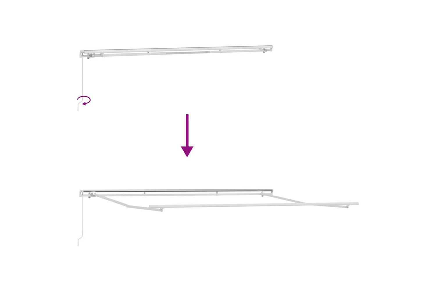 Danger! Strong spring when opens. DO NOT remove this rope unless you have finished all of the assembly steps with all bolts are fastened and the item is attached to the wall! Warning! Take care when loosening the arms, because they are under tension! A sudden release of the arm of a folding arm awning can cause injury. Warning: The operator’s instruction shall be read before the use of the product. Warning: The operation in frosty conditions may damage the product. External use in buildings and other construction works.