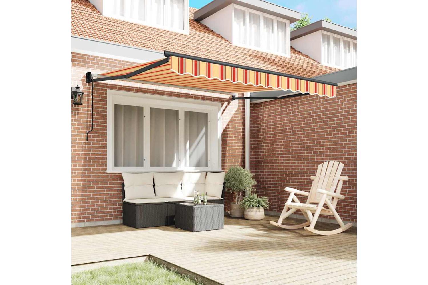 Materials: Made with durable polyester that can handle the weather without fading. This ensures the awning keeps its bright colours even after a lot of sun exposure, and it stays strong for years of protection and good looks. Included Components: The awning comes with a solid metal frame that gives it the stability and support it needs. The retractable mechanism lets you customise your shading, while the manual adjustment system makes it easy to get the coverage you want. Every part is designed to boost the awning’s durability and enhance user experience. Features / Function / Design: This awning has weather-resistant qualities, thanks to UV-resistant materials and a powder-coated finish that keeps it tough against the elements. Its striped design gives it a unique visual twist, while the clean lines fit right into modern outdoor spaces, balancing elegance with practicality. Recommended Uses: Ideal for summer in gardens and terraces, this awning helps create a comfy outdoor vibe in all sorts of settings. It's perfect for hosting parties or just relaxing, adapting easily to whatever occasion, whether you’re entertaining guests or enjoying a good book. Care & Maintenance: Made for outdoor use, this awning is easy to clean with regular dusting. If it gets dirty, a gentle rinse with water will keep it looking sharp. Following care instructions ensures this awning remains a lasting part of your outdoor space.