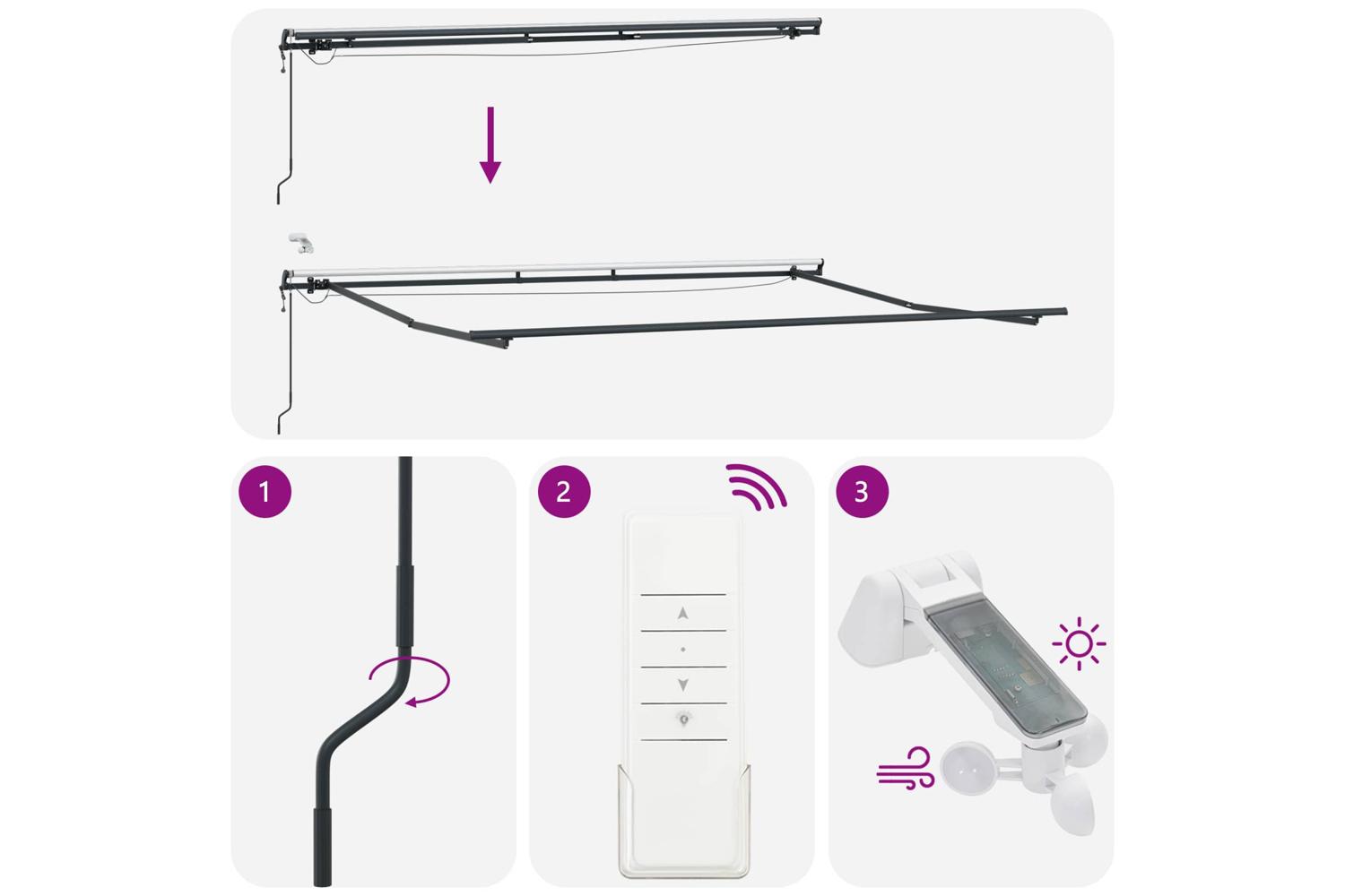 Danger! Strong spring when opens. DO NOT remove this rope unless you have finished all of the assembly steps with all bolts are fastened and the item is attached to the wall! Warning! Take care when loosening the arms, because they are under tension! A sudden release of the arm of a folding arm awning can cause injury. Warning: The operator’s instruction shall be read before the use of the product. Warning: The operation in frosty conditions may damage the product. External use in buildings and other construction works. Do not allow children to play with the control device of the blind. Keep remote control away from children.