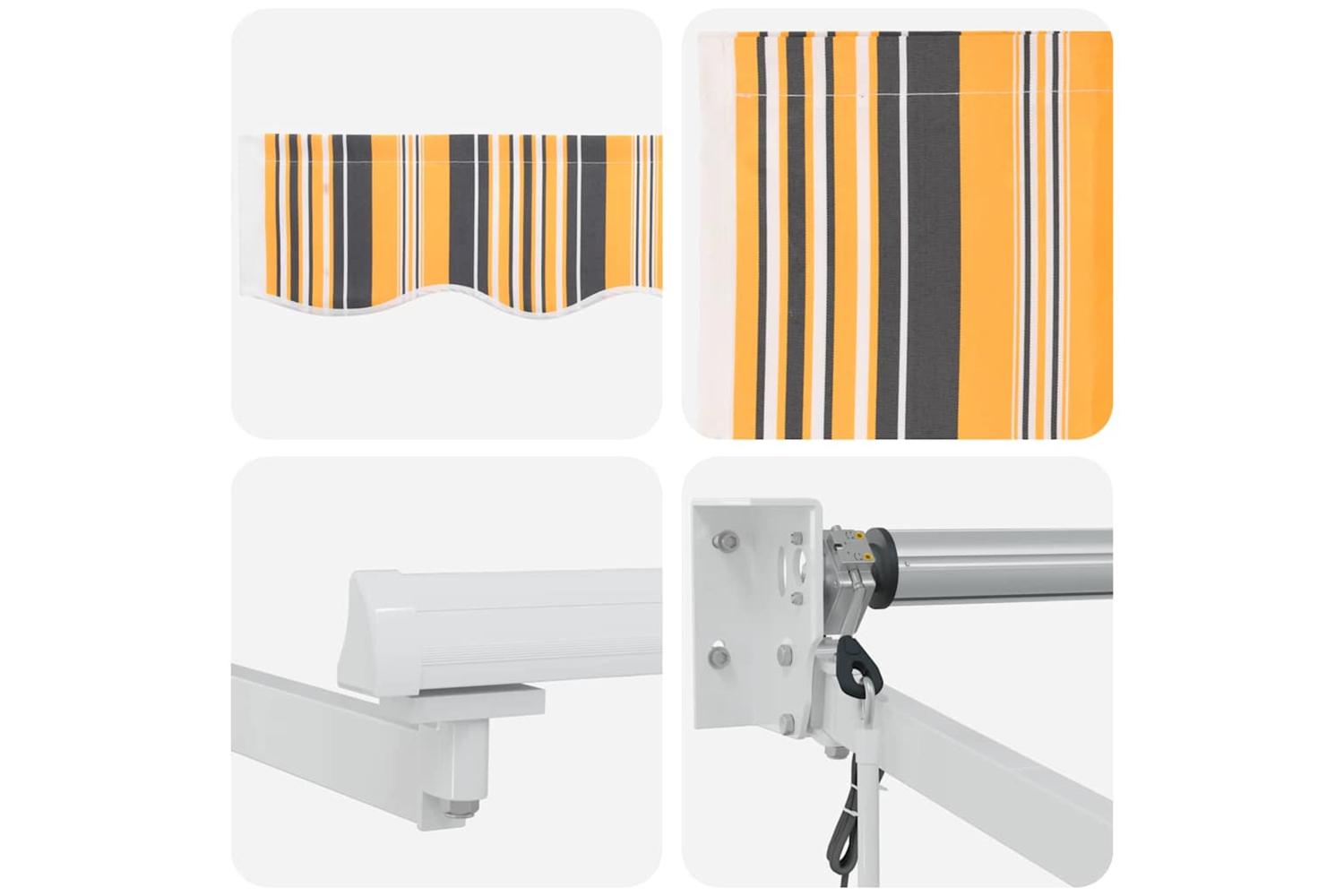 Bold Striped Design: This awning sports a vibrant pattern of stripes in yellow, grey, and white. These bright colours, alongside the modern look, instantly lift your outdoor space, adding a fun touch that complements a variety of setups. Polyester Fabric: Made from quality polyester, the awning is tough and durable. It resists fading and stands up to various weather conditions, keeping its colour and texture for a long time. It's a top pick for those wanting both style and reliability. Retractable Mechanism: With an easy-to-use retractable system, you can extend or hide the awning as you please. This feature gives you control over how much shade you want, making it flexible for different times of the day or weather. And the remote control makes it super convenient. Aluminium Frame: The awning sits on a strong aluminium frame, providing a lightweight yet sturdy structure. Aluminium is naturally resistant to , ensuring a stable base that can handle challenges while keeping the awning working smoothly. Maintenance & Care: To keep your awning looking great, just clean it with cold water and avoid harsh chemicals. Regularly check and tighten loose screws to ensure everything stays in top shape. This easy maintenance helps keep the awning vibrant and functional for years to come.