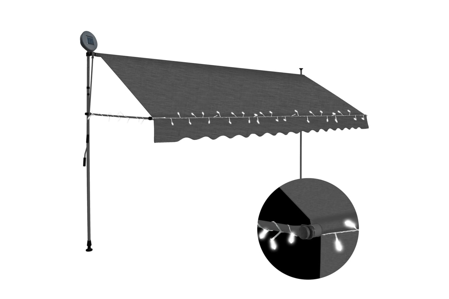 This water- and dirt-repellent and UV- and weather-resistant awning is made of quality polyester with a PU coating. The strong steel frame makes the awning sturdy and durable. The easy-to-clean polyester canopy can be removed and washed. Thanks to the handle crank, this awning is retractable. The height and the angle of the awning can also be adjusted. In addition, those solar-powered LED lights provide lighting at night. The awning is easy to assemble.
