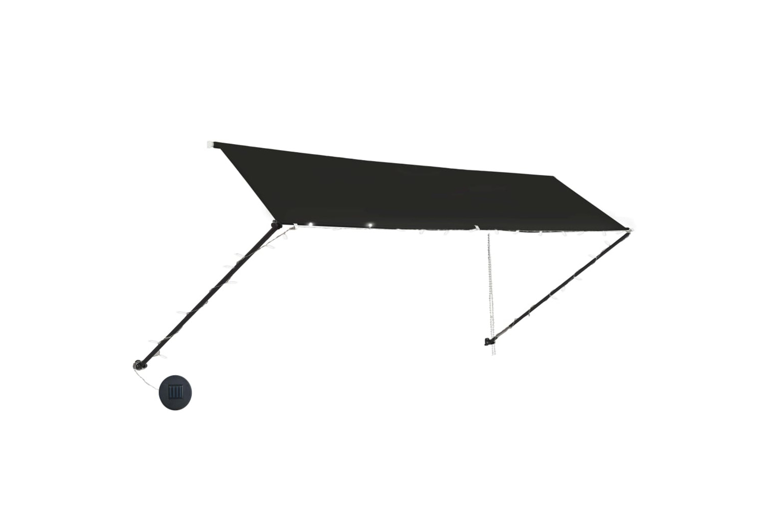 This water, UV and weather-resistant awning is made of quality fabric with a PA coating. Meanwhile, the strong steel frame enables the awning sturdy and durable. The easy-to-clean polyester canopy can be removed and washed. This product can not only be used as an ordinary awning, but also cover the window completely in the meantime. Thanks to the supporting bar and chain, this awning is retractable. The height and the angle of the awning can also be adjusted to maximise the shade. In addition, the solar powered LED lights provide energy saving lighting at night.