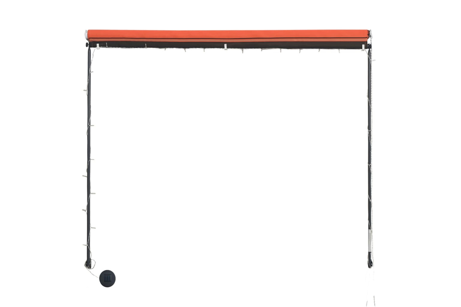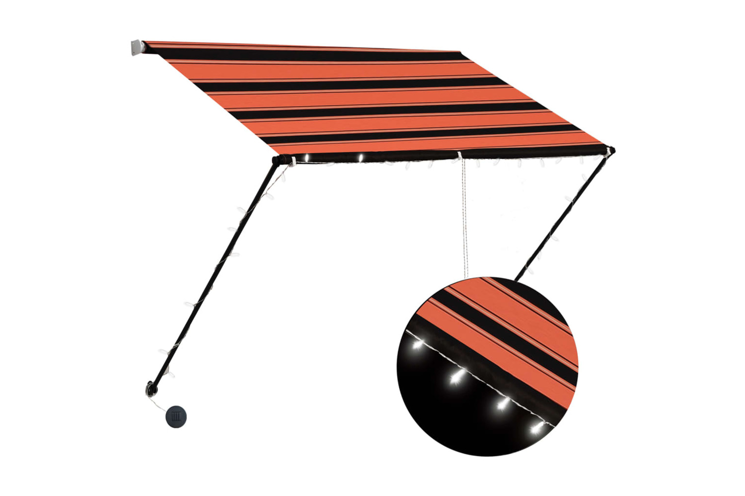 This water, UV and weather-resistant awning is made of quality fabric with a PA coating. Meanwhile, the strong steel frame enables the awning sturdy and durable. The easy-to-clean polyester canopy can be removed and washed. This product can not only be used as an ordinary awning, but also cover the window completely in the meantime. Thanks to the supporting bar and chain, this awning is retractable. The height and the angle of the awning can also be adjusted to maximise the shade. In addition, the solar powered LED lights provide energy saving lighting at night.
