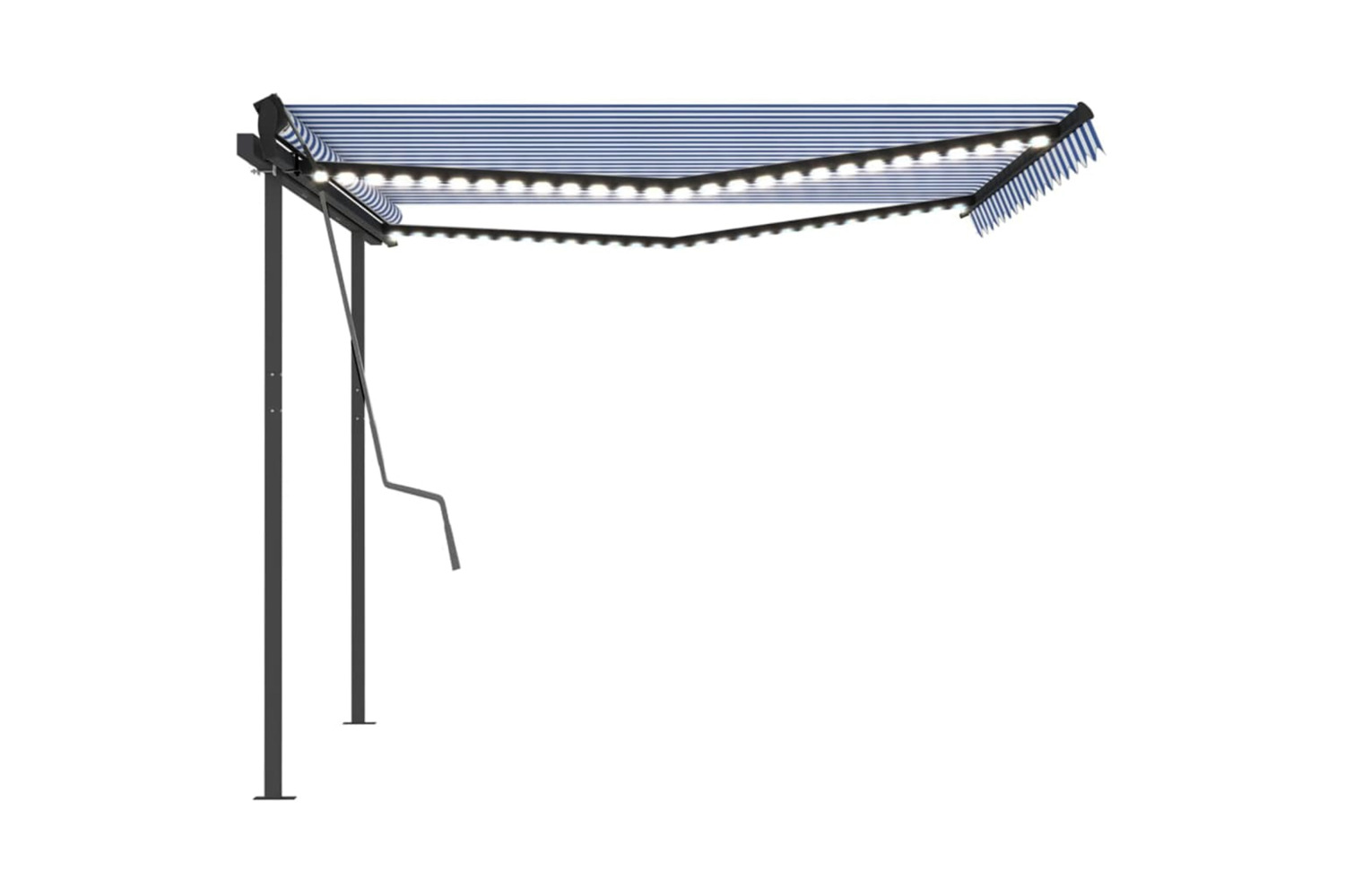 This outdoor awning, built with a rust-resistant, powder-coated aluminium frame, is lightweight yet sturdy. The strong iron post makes it stable. The patio awning's fabric is made of high-density polyester with PU coating, which is water-resistant and UV-resistant. The angle and height can be adjusted to meet your specific needs. You can open and retract the awning smoothly through the long hand crank. What's more, the solar-powered LED lights provide energy-saving lighting at night.