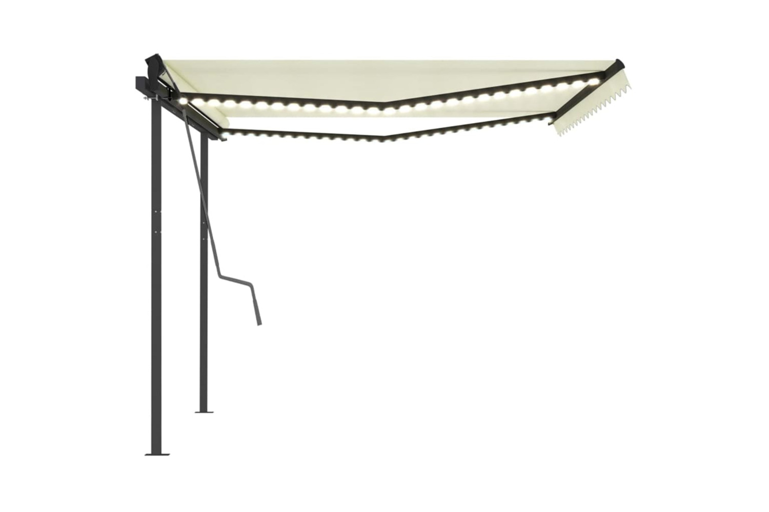 This outdoor awning, built with a rust-resistant, powder-coated aluminium frame, is lightweight yet sturdy. The strong iron post makes it stable. The patio awning's fabric is made of high-density polyester with PU coating, which is water-resistant and UV-resistant. The angle and height can be adjusted to meet your specific needs. You can open and retract the awning smoothly through the long hand crank. What's more, the solar-powered LED lights provide energy-saving lighting at night.