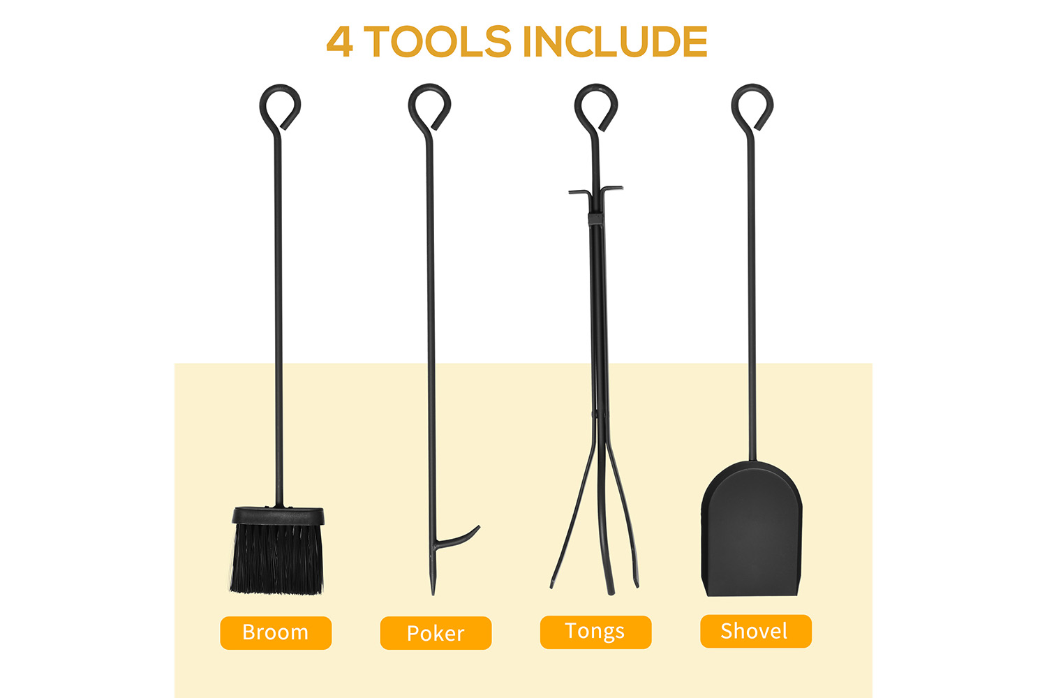 • Broom, poker, shovel and tong included for extra help
