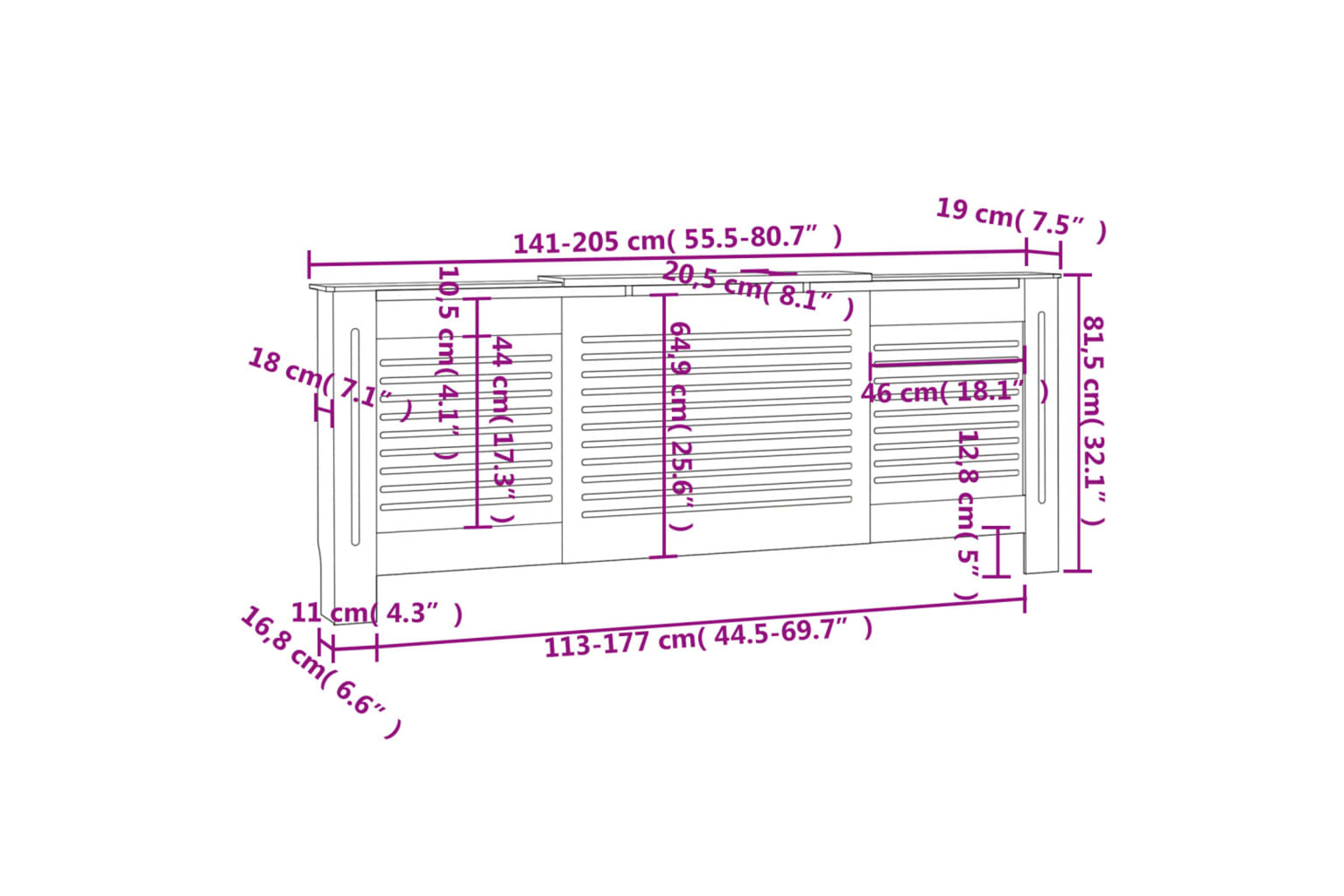 This radiator cover cabinet is made of MDF, sturdy and durable. It features a modern slatted design, making it suitable for any decor. The shelf provides ample space for placing your books, photo frames, ornaments, etc.