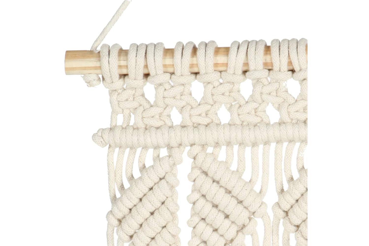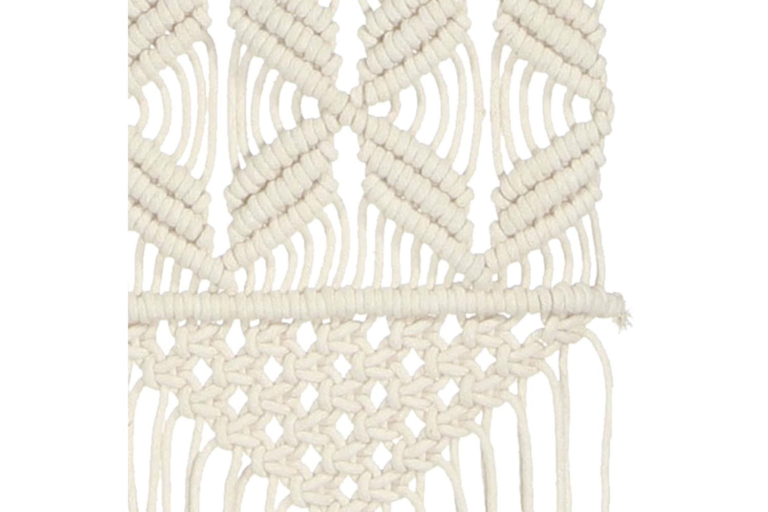 This wall hanging is handmade from cotton. The fringed bottom brings a bohemian vibe to mind. Additionally, the wall hanging features a rope in the top, making it easy to attach a hook.