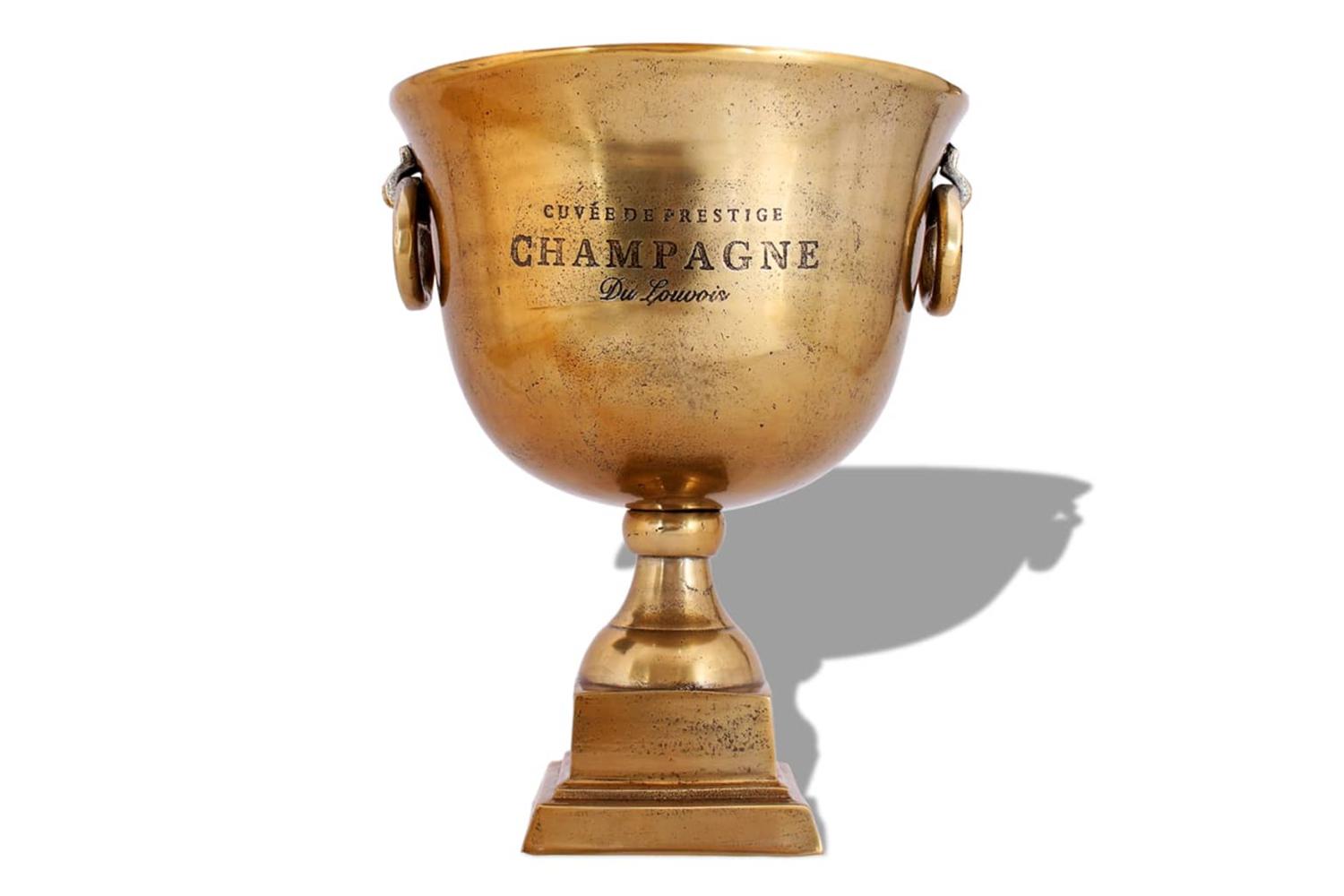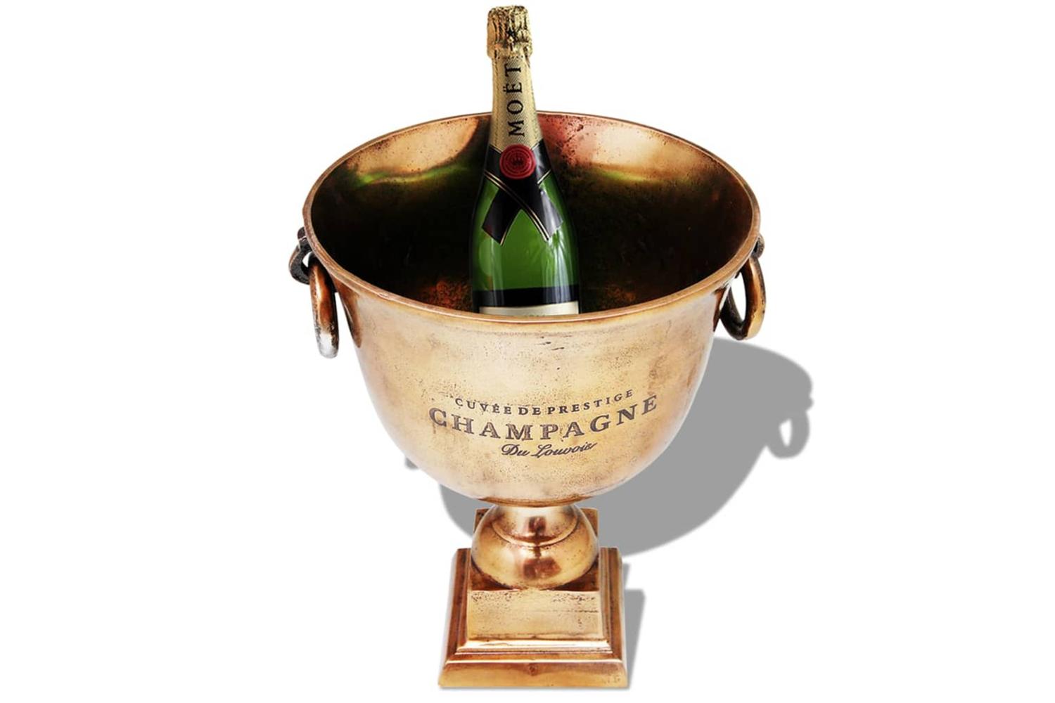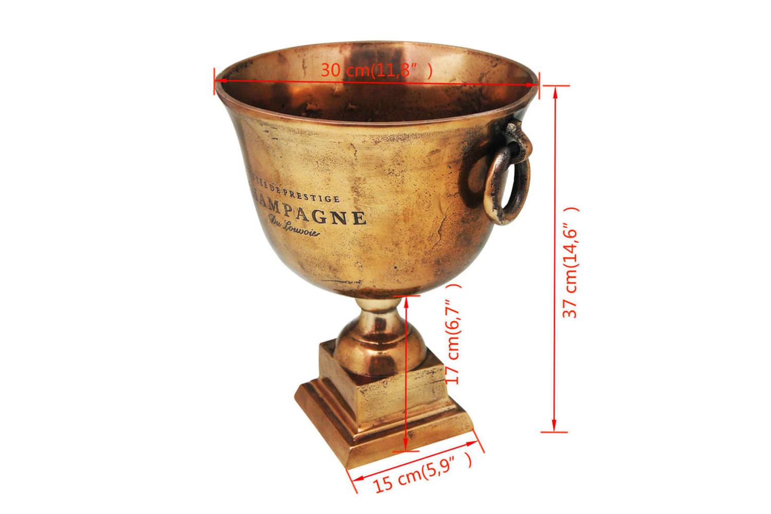 The wine cooler is made of high-quality copper, which is sturdy, stable and durable. There is plenty of room for ice, so the bottle cooler is excellent for keeping champagne, wine or other beverages cool. The sekt cooler has the shape of a trophy cup and has two convenient side handles.