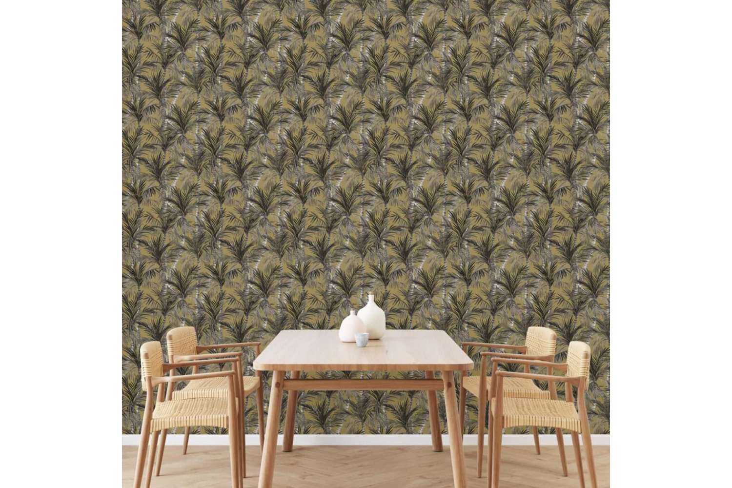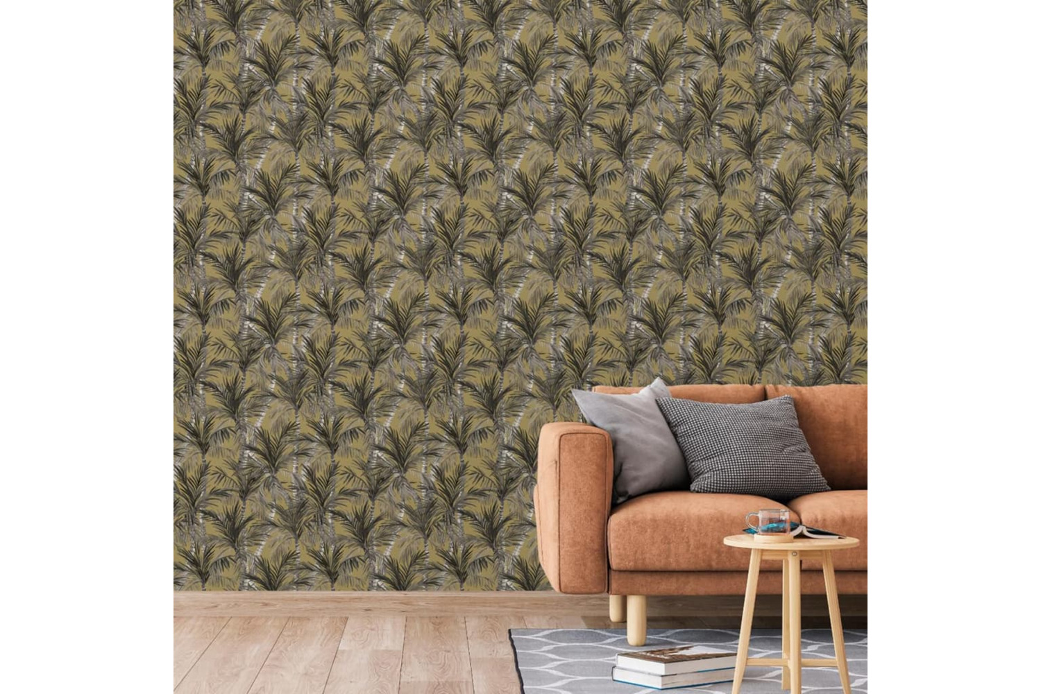 The durable wallpaper has an intense design with palm trees pattern in gold and black colours. It can even be removed dry without damaging your wall.