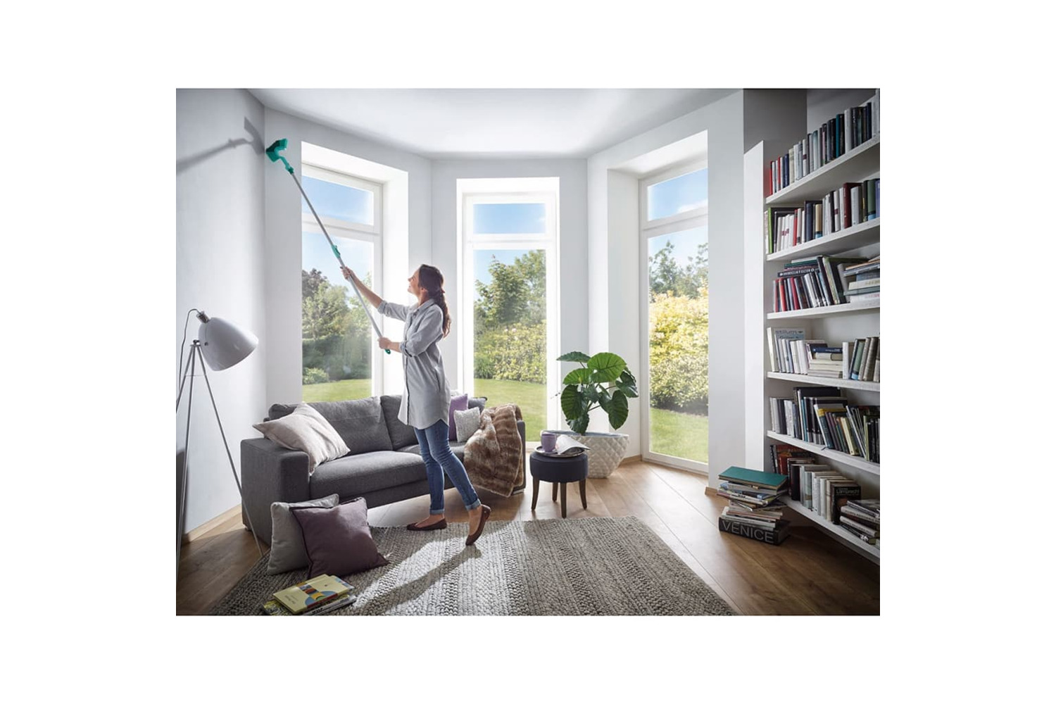 Thanks to its unique shape, the Dusty removes dirt and dust in every corner more efficiently than normal dusting brushes. Its telescopic handle is extendable from 110 to 190 cm. The handle joint is adjustable in several different cleaning angles, so that even hard-to-reach areas like doorframes and the top of armoires can be cleaned easily. When cleaning high rooms like in old buildings, simply extend the handle to the desired length and lock the brush head in the optimal working angle.