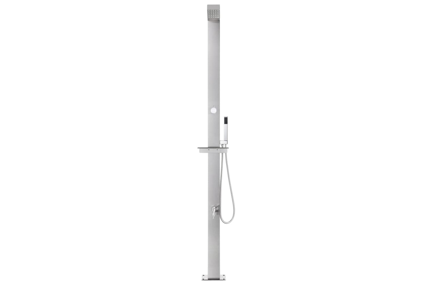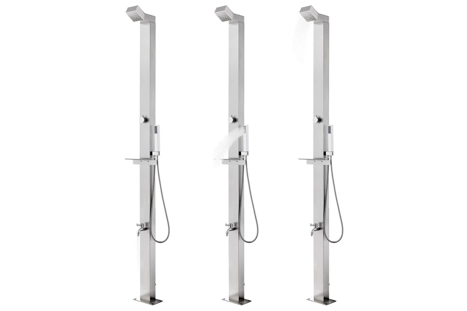 This outdoor shower is made of stainless steel, making it weather-resistance. The shower system has a head shower, a hand shower and a foot wash faucet to meet your gardening, watering and quick showering needs. The double-locked hose is flexible and designed for hand shower. It is also equipped with a plastic hand shower holder and a shelf for hanging up the water hose easily.