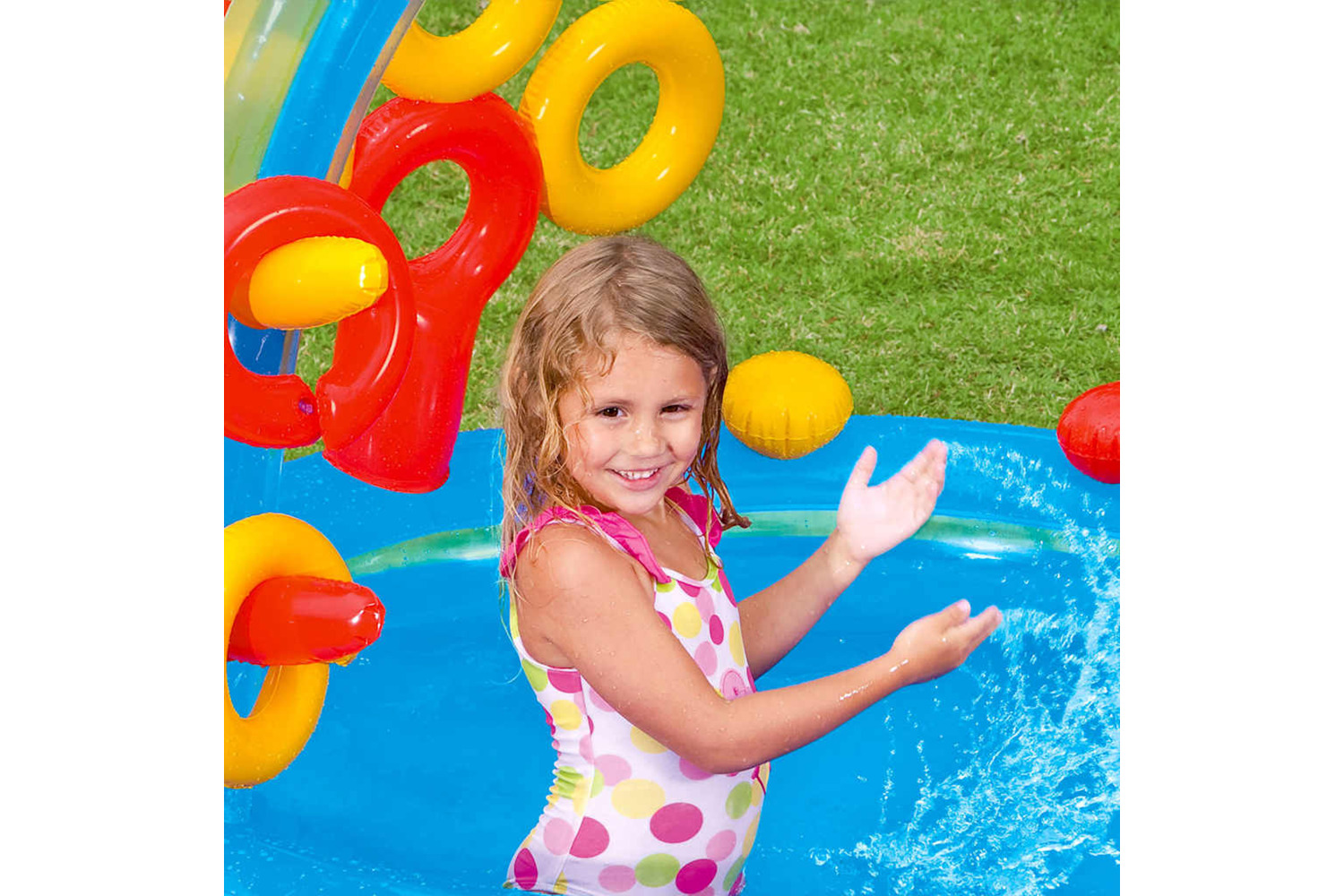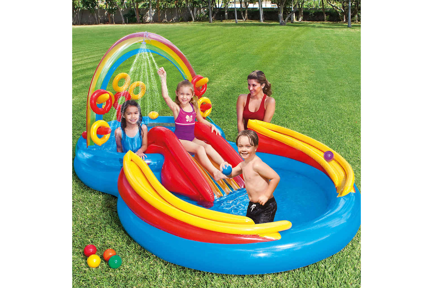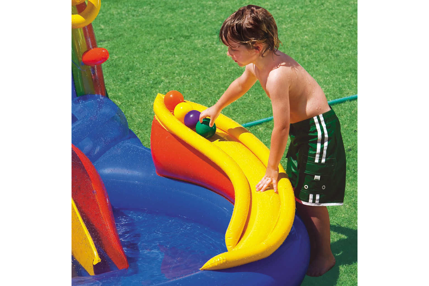 - Including water slide, wading pool, water sprayer, ring toss game (with four inflatable rings), ball roller game and toss ball game